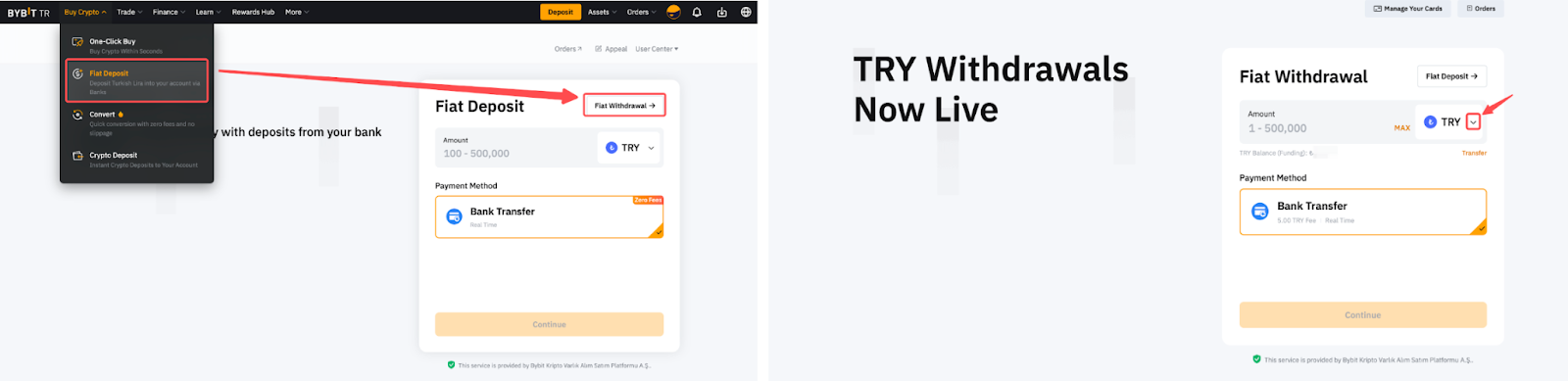 Bybit TR’te yalnızca belirli miktarda itibari para birimi çekilebilir. İtibari para çekme için desteklenen itibari para birimlerini İtibari Para Çekme sayfasında görebileceksiniz.