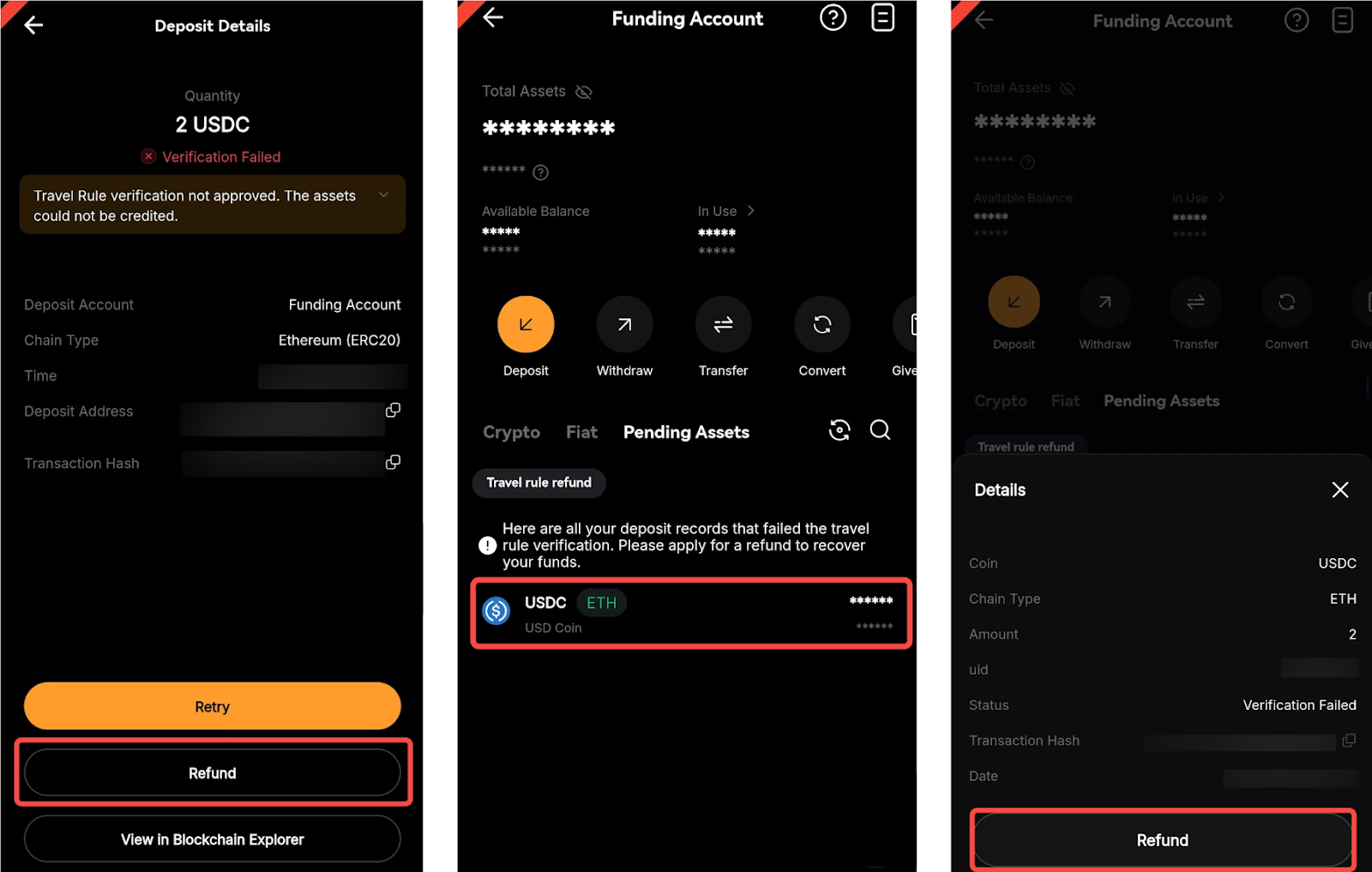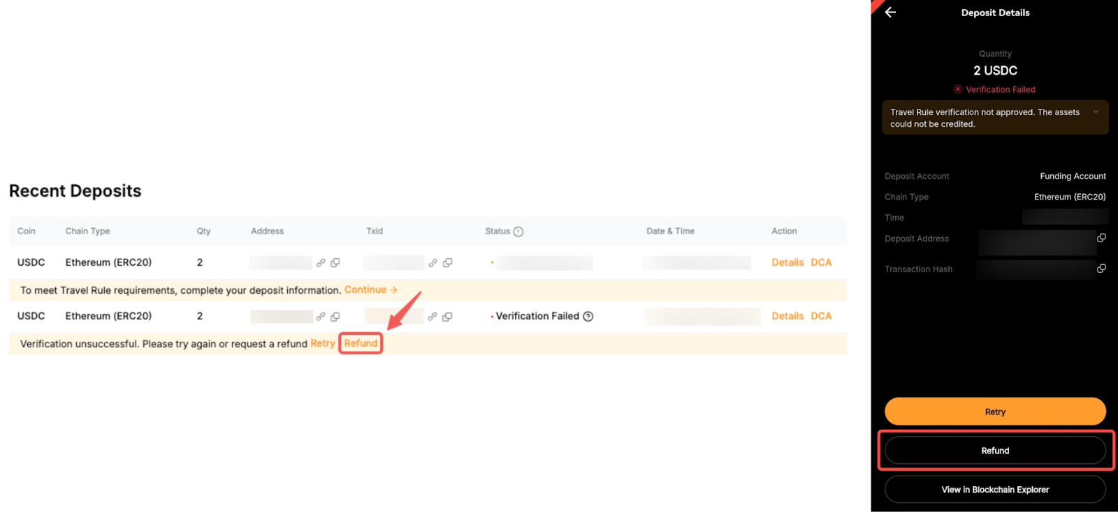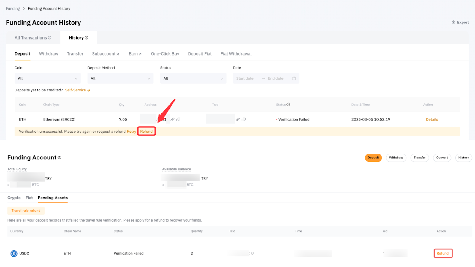 Evet, doğrulama başarısız olursa farklı bir cüzdan adresine geri ödeme başlatabilirsiniz. Geri ödeme başlatmak için Yatırma Geçmişi sayfasında istediğiniz işlem için Geri Ödeme seçeneğine tıklayın. Geri ödeme ayrıntılarını girmeniz için bir çekim penceresi açılacaktır. Geri ödeme başlatmak için coini, zincir türünü seçin ve alıcı cüzdan adresini ve coin miktarını girin.