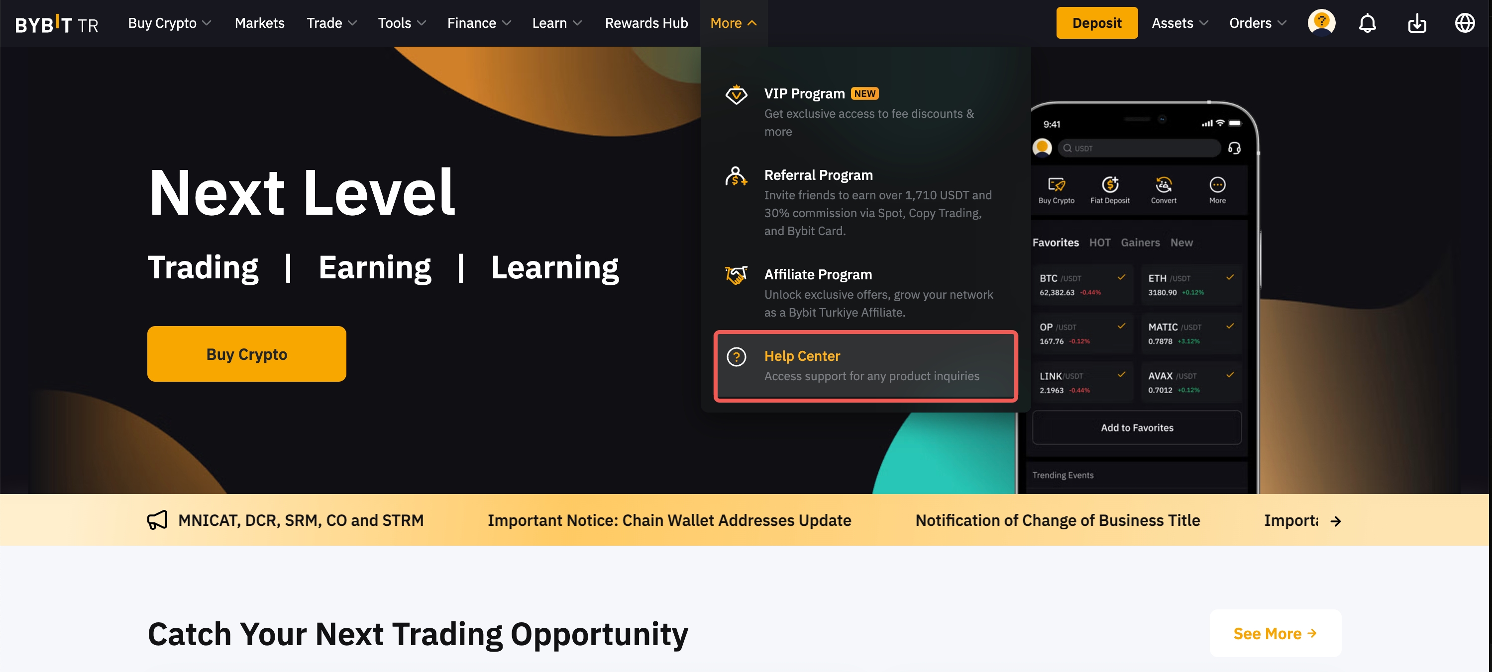 Bybit TR Uygulamasını kullanıyorsanız lütfen ana sayfadaki Daha Fazla seçeneğine ve ardından Yardım Merkezi’ne dokunun.