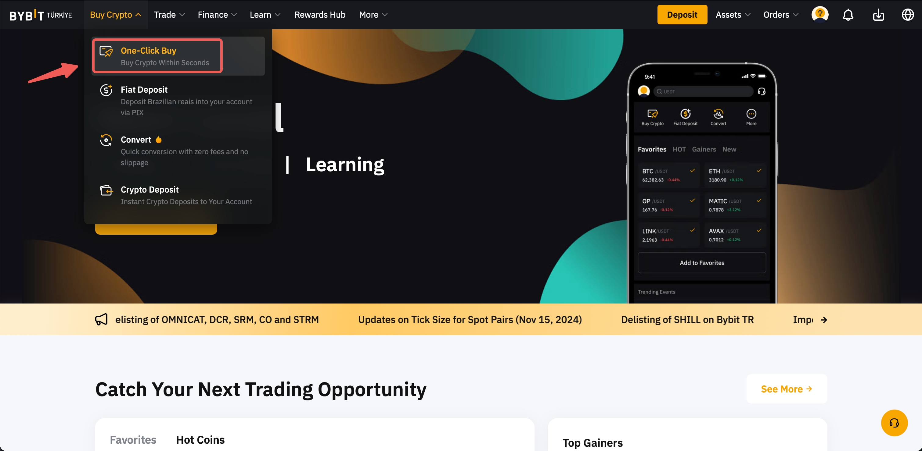1. Adım: Tek Tıkla Satın Alın sayfasına girmek için gezinti çubuğunun sol üst köşesinde bulunan Kripto Satın Al → Tek Tıkla Satın Alın seçeneğine tıklayın.