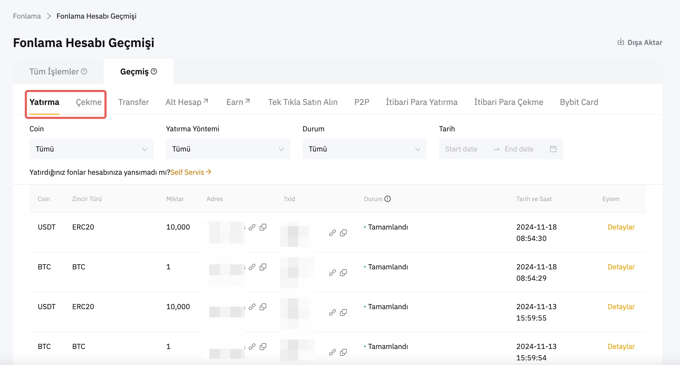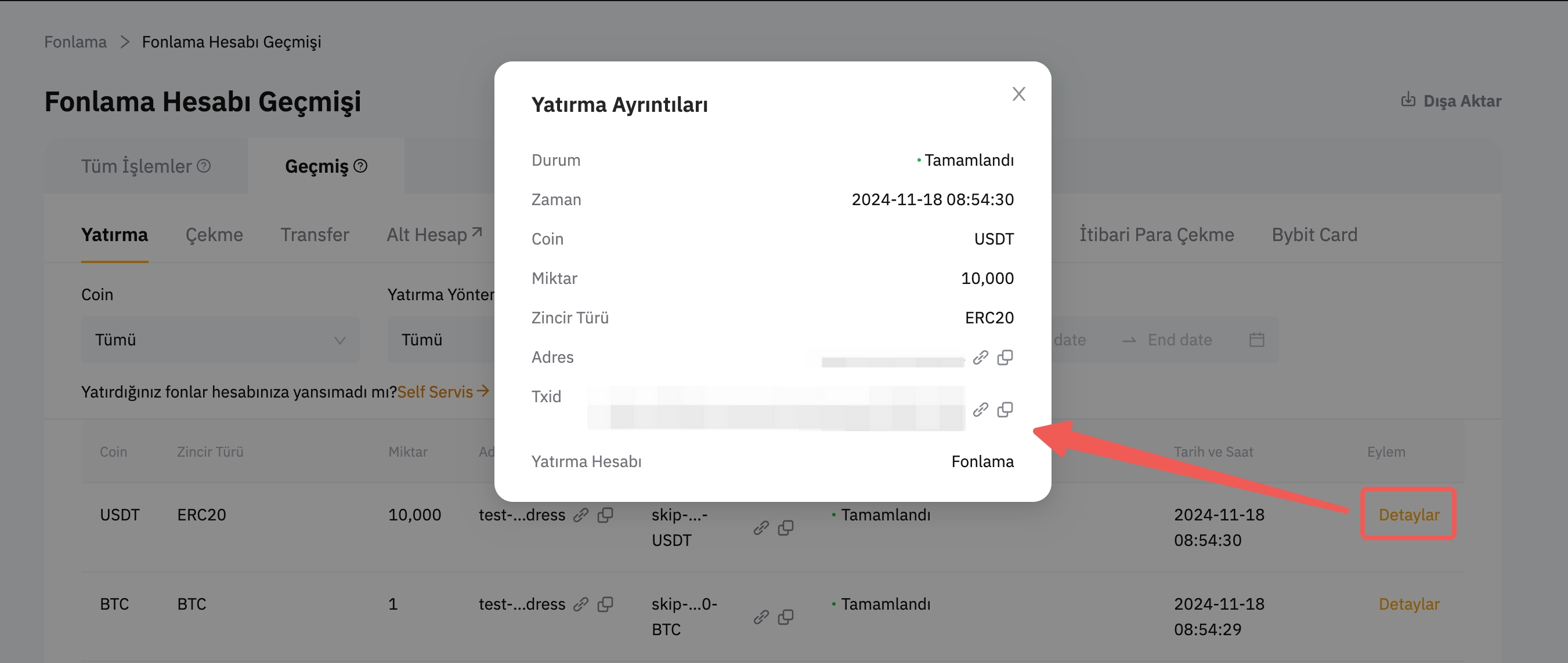 — Yatırma geçmişinizde yatırma bilgilerinizi bulamıyorsanız işleminiz Bybit TR hesabınıza yatırılmamış olabilir. Bu gibi durumlarda, yatırılan fonunuzu geri almayı talep etmek için lütfen buradaki SSS bölümümüze bakın.