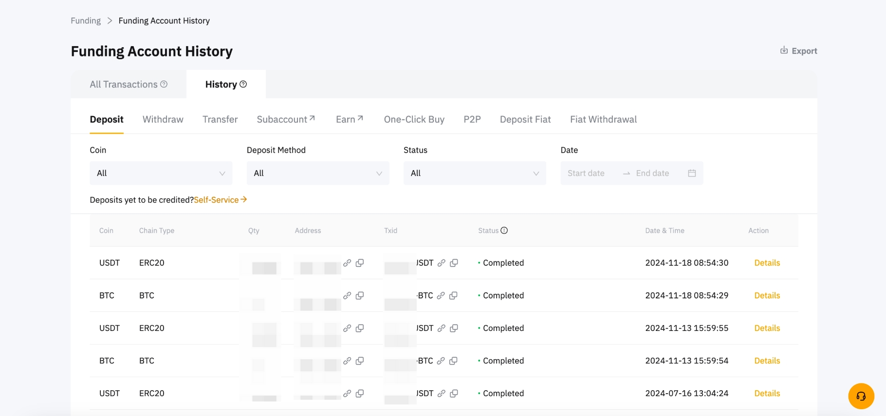 Eylem sütunu, devam eden yatırma işlemleri için kullanılabilecek çeşitli eylemleri görüntüler. Yatırma işlemi tamamlanınca Ayrıntılar butonu, fonların aktarıldığı hesap türüyle birlikte işleminizin TxID’sini gösterir.
