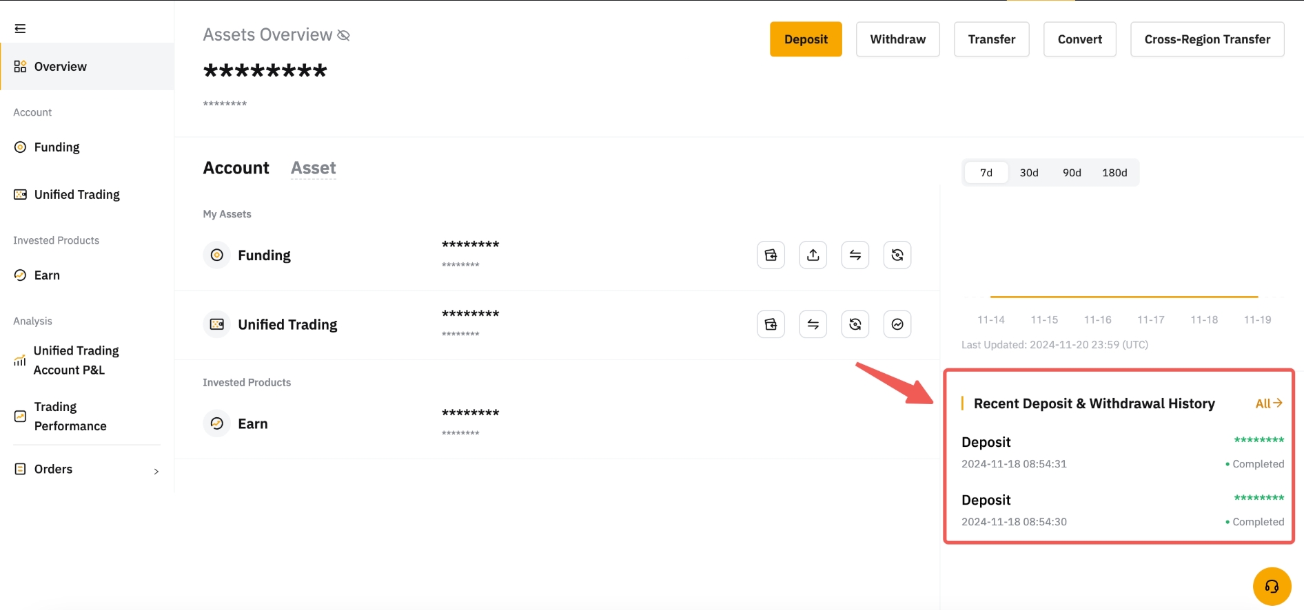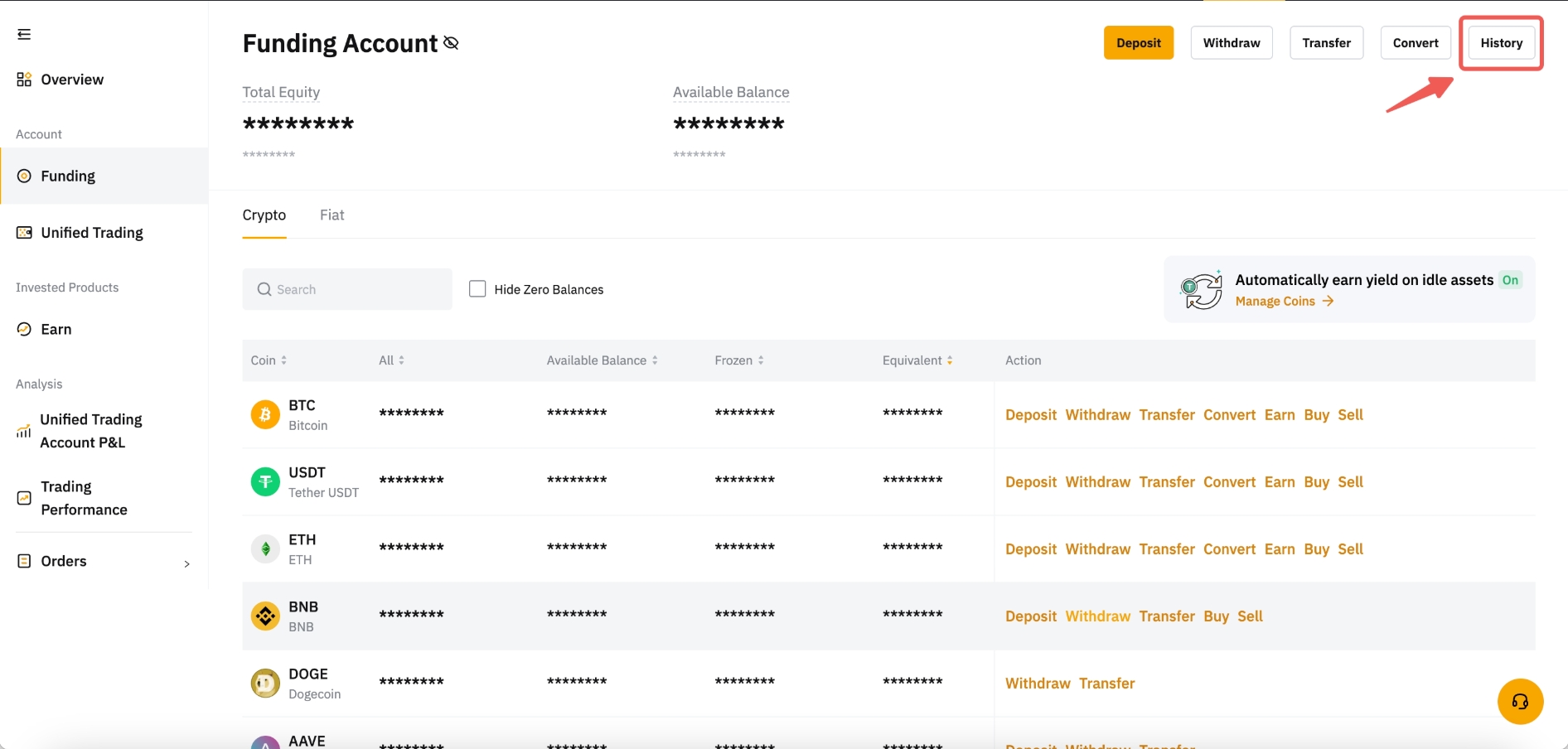 Yatırma ve çekme işlemlerinizin geçmişini görüntülemek için sağ üst köşedeki Varlıklar seçeneğine tıklayın veya Varlıklar menüsünden Spot veya Fonlama Hesabınızı seçin.