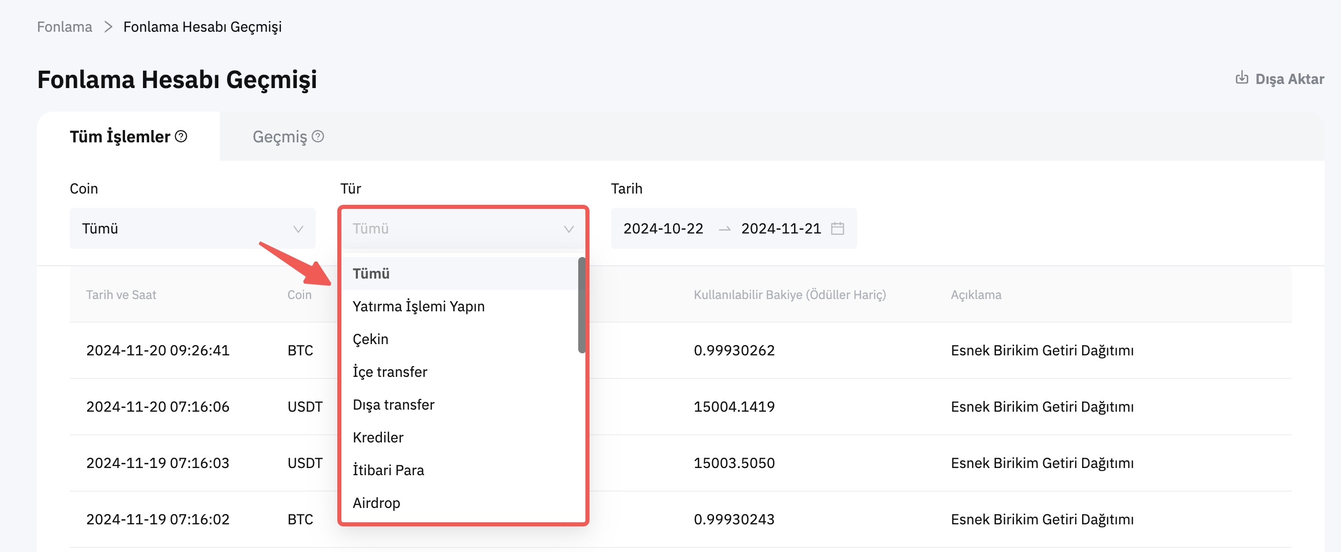 Not: Tüm İşlemler sekmesinde sadece son 90 günde gerçekleştirdiğiniz yatırma ve çekme işlemleri gösterilir. Tür menüsünde Yatırma veya Çekme seçeneklerinden hangisi seçilirse menü sonuçları ona göre filtreler.