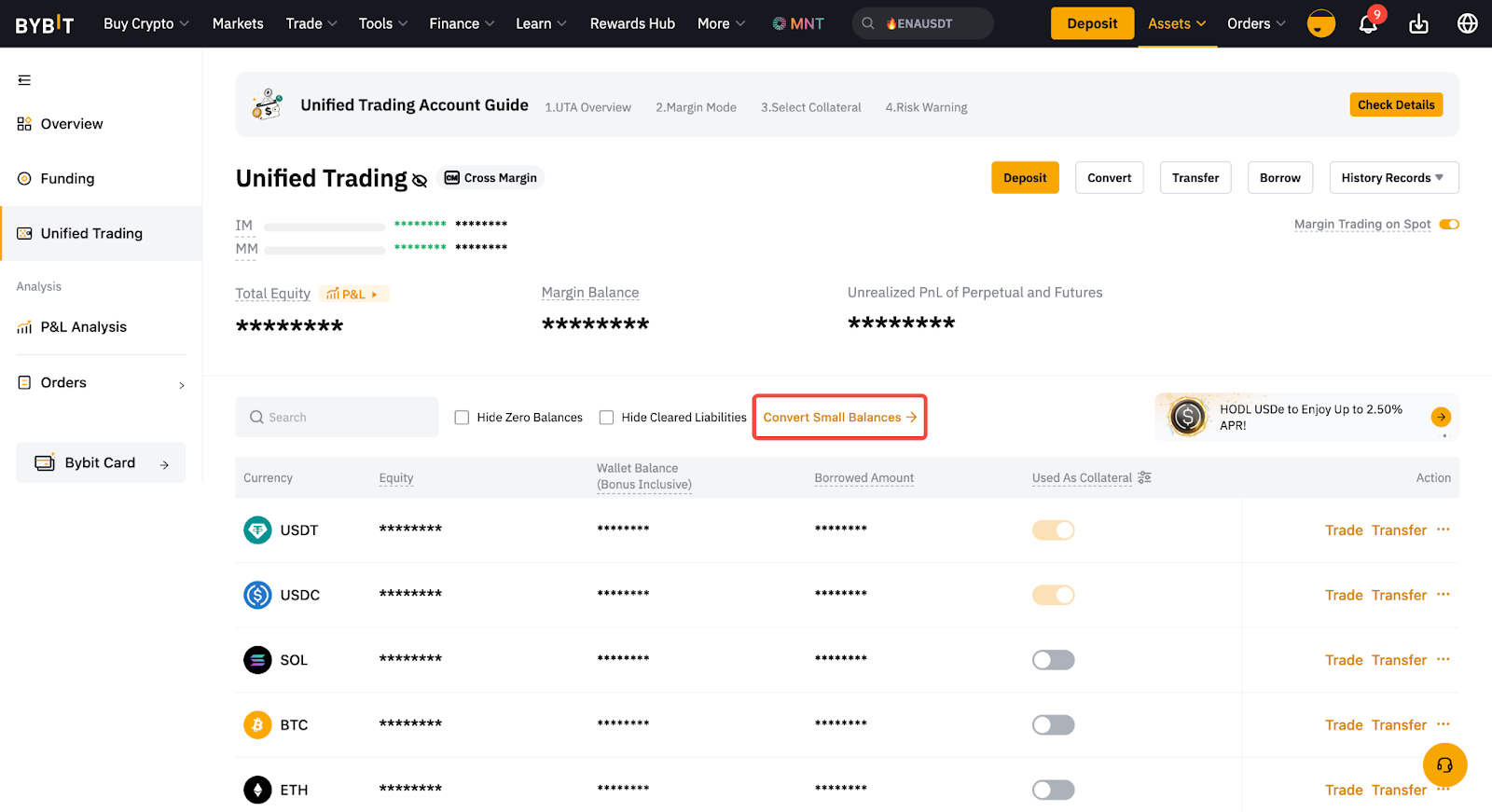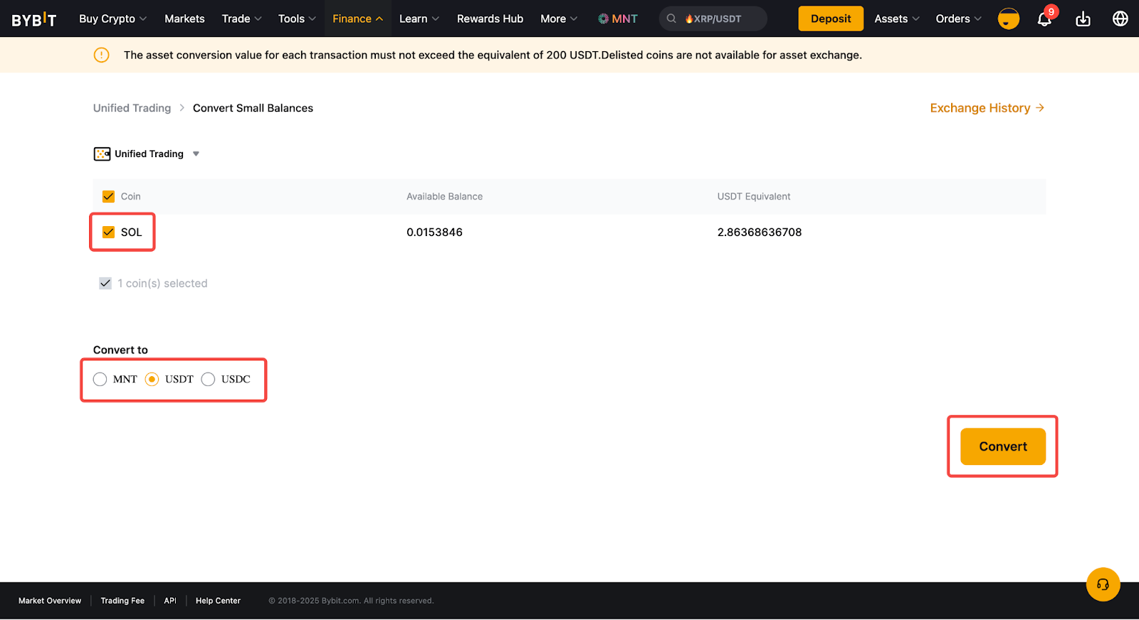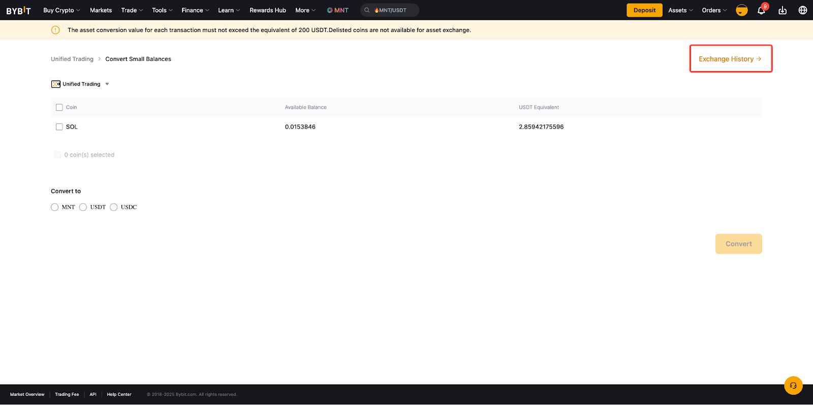 Bybit TR hesabınızdaki küçük varlıkların kullanımını iyileştirmek için, 0,001 BTC veya eşdeğerinden daha düşük değerdeki varlıkları dört basit adımı izleyerek tek bir dönüşümde MNT, USDT veya USDC'ye dönüştürebilirsiniz. Düşük bakiyelerin dönüştürülmesi, hem Fonlama Hesabı hem de Birleştirilmiş Alım Satım (UTA) kullanılarak desteklenir. Lütfen düşük bakiye dönüşümünün her 1 saatte bir ile sınırlı olduğunu unutmayın.