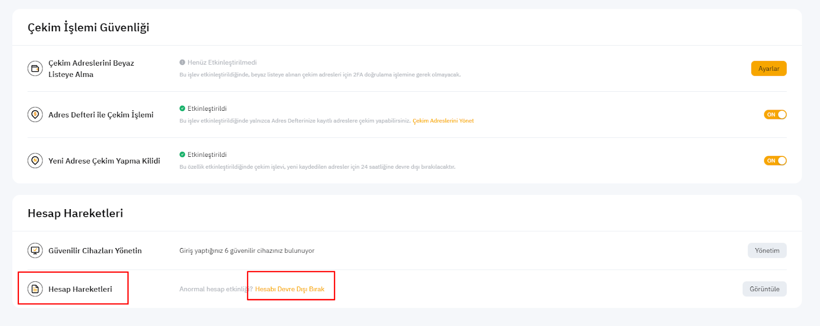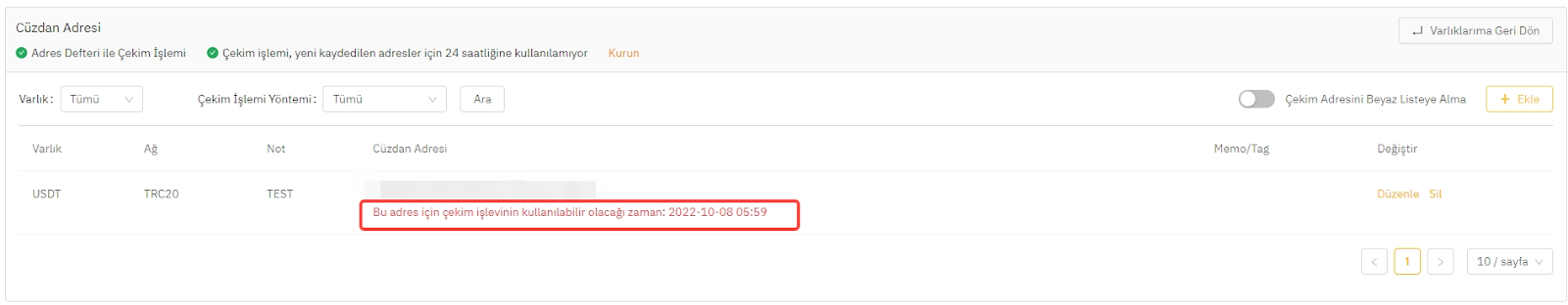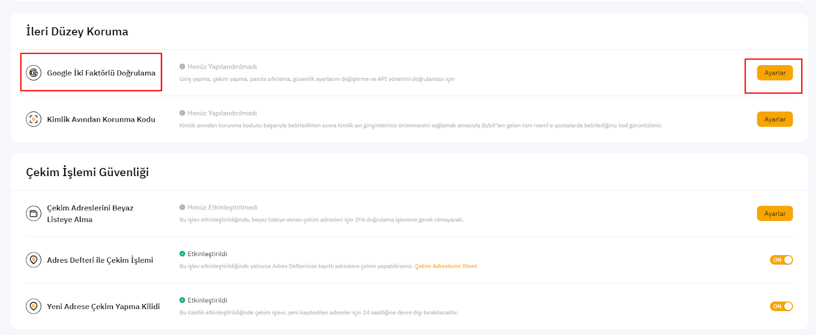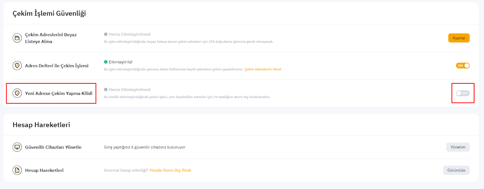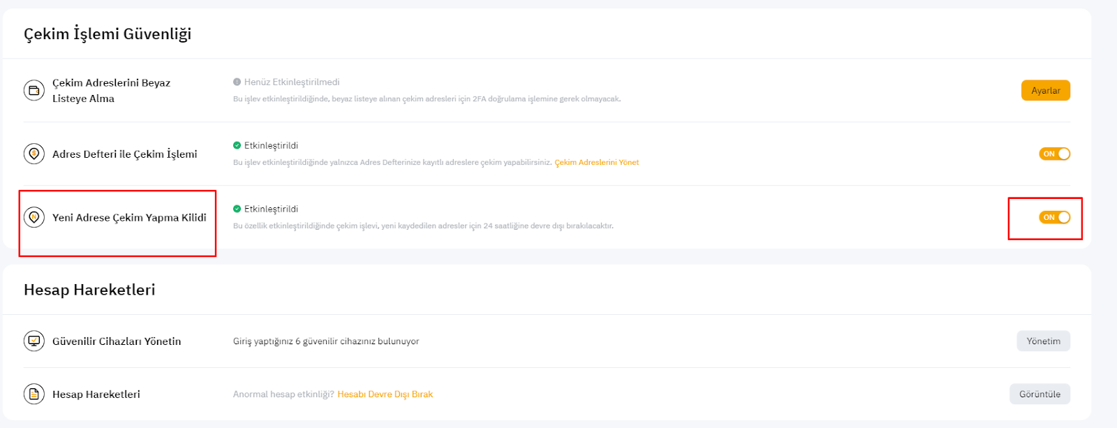 Bu işlevi etkinleştirdikten sonra, yeni eklenen çekim adresi sonraki 24 saat boyunca çekim işlemleri için kullanılamaz. Para çekme güvenliğinizi yönetmek için lütfen burayı ziyaret edin.