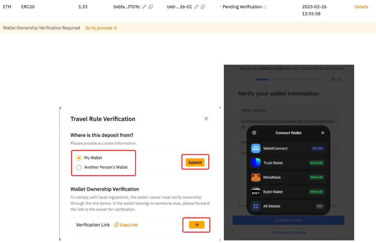 Kişisel Cüzdan (Metamask veya başka bir merkeziyetsiz cüzdan sağlayıcı gibi) aracılığıyla yapılan yatırma işlemleri için kullanıcıların cüzdan sahipliği doğrulamasını tamamlamaları gerekmektedir. Yatırma işleminiz VASP’den (diğer borsalardan) geliyorsa bu adımı atlayabilir ve 6. adıma geçebilirsiniz.