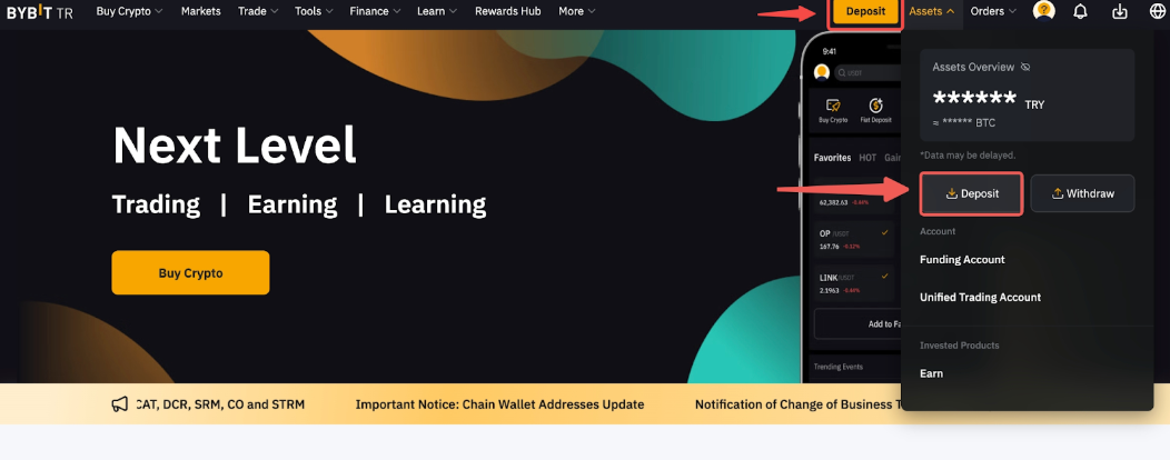 Kripto yatırma, blok zinciri işlemi aracılığıyla harici bir cüzdandan veya başka bir borsadan Bybit TR hesabınıza kripto transferidir. Kripto yatırma işlemini nasıl yapacağınızı gösteren adım adım kılavuzu aşağıda bulabilirsiniz.