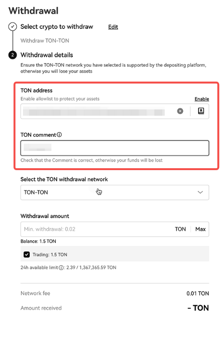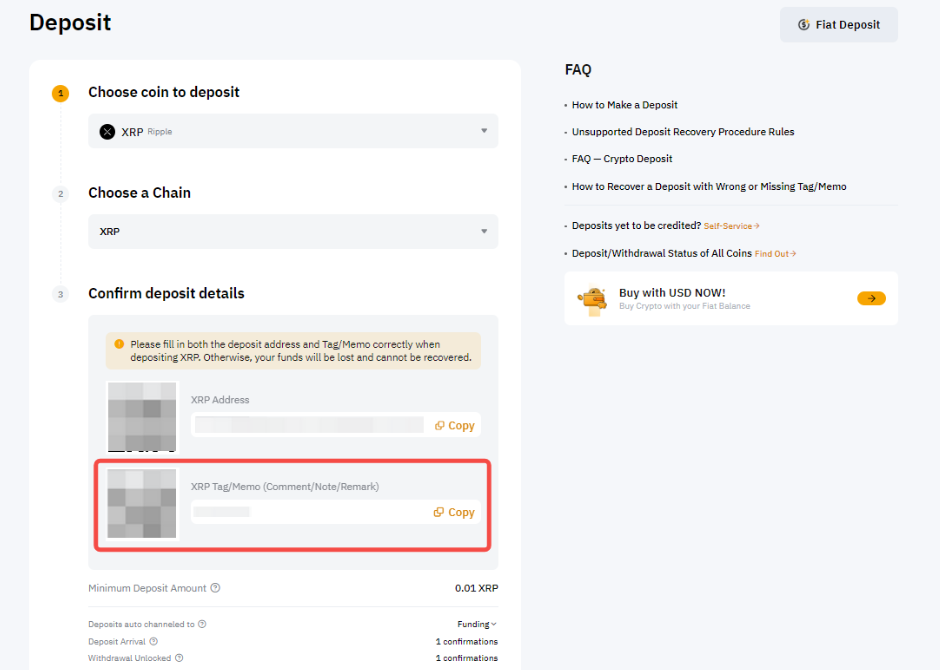 — XRP, EOS, TON zinciri ve daha fazlası gibi yatırma etiketi/memosu gerektiren coin yatırma işlemleri için lütfen çekim isteği sayfanızın Yorum/Not/Tag alanında yatırma notunuzu/taginizi doğru bir biçimde girdiğinizden emin olun. Notunuzu/taginizi aşağıda gösterildiği gibi yatırma penceresinden bulabilirsiniz. Bir memo/etiket olmadan veya yanlış memo/etiket ile yatırma işlemi, varlıkların kaybedilmesine neden olabilir. Daha fazla bilgi için lütfen SSS — On-chain Kripto Yatırma bölümüne bakın.