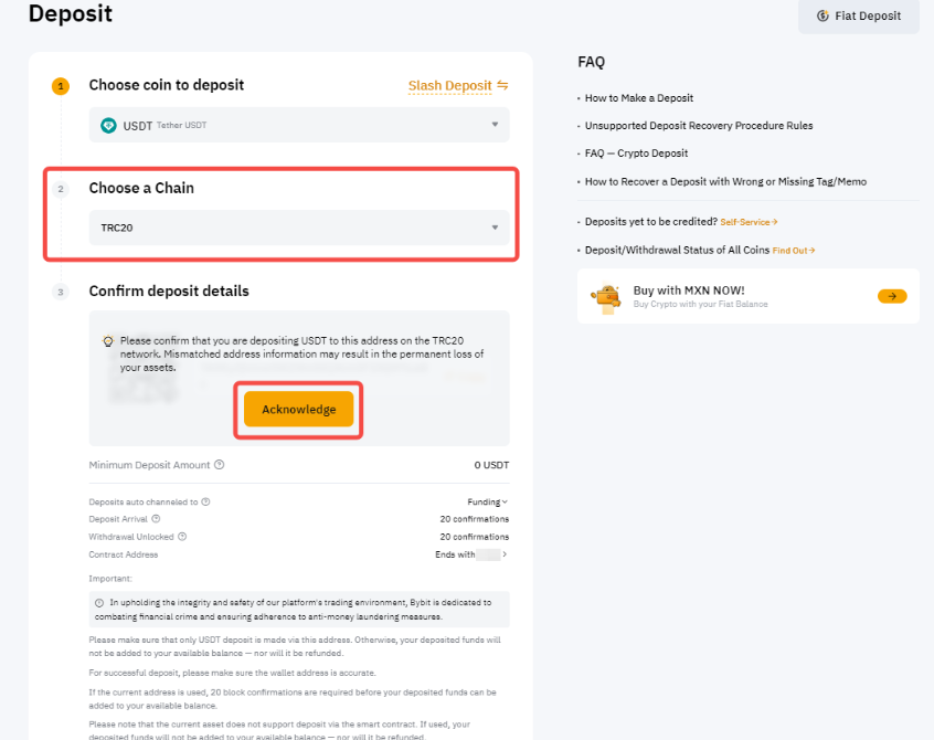 3. Adım: Kullanacağınız zincir türünü seçin. Bilgi mesajını onayladıktan sonra Bybit TR yatırma adresinizi göreceksiniz. QR kodunu tarayabilir veya yatırma adresini kopyalayabilir ve fonları gönderebileceğiniz hedef adres olarak kullanabilirsiniz.