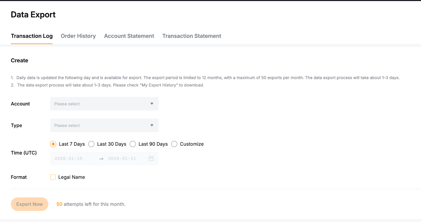 - İşlem Günlüğü ve Emir Geçmişi için dışa aktarma işlemi, dosya boyutuna ve indirmek istediğiniz işlemin süresine bağlı olarak yaklaşık 1-3 gün sürecektir. Bu arada, Hesap Özetinin oluşturulması yaklaşık bir (1) iş günü sürer.