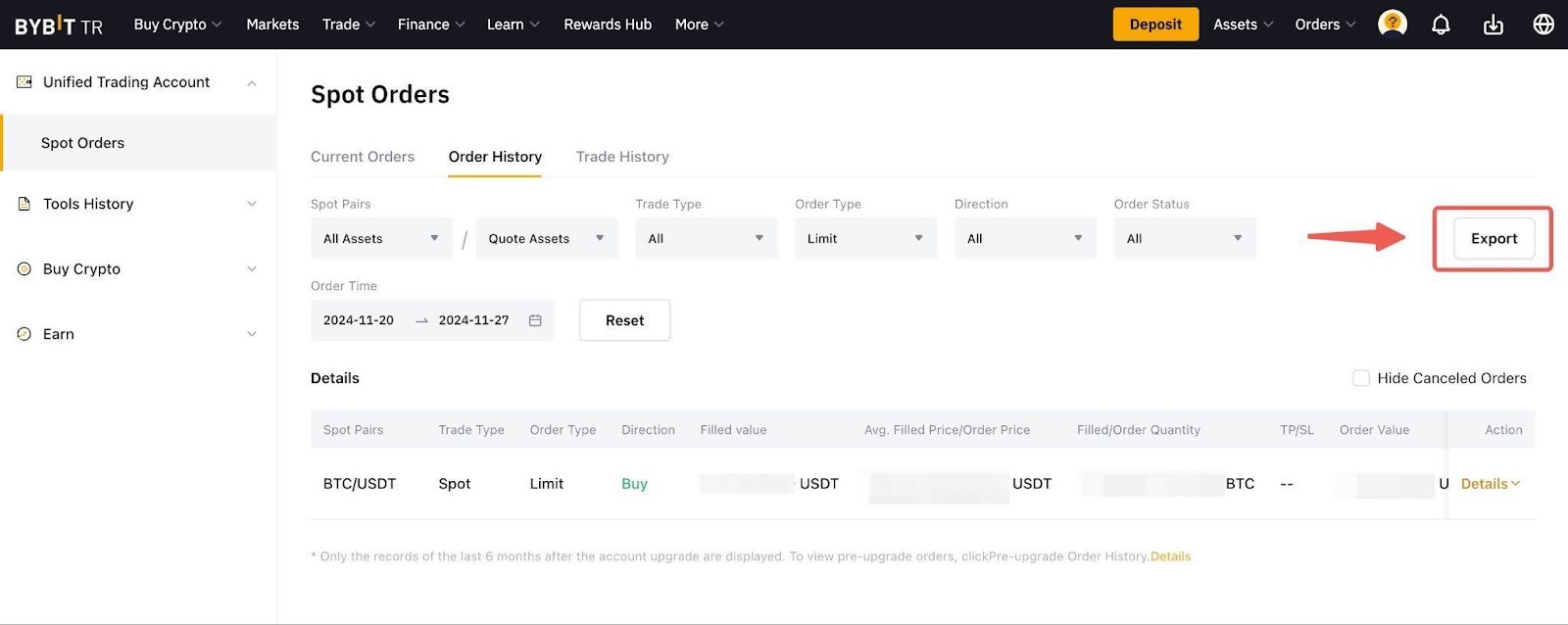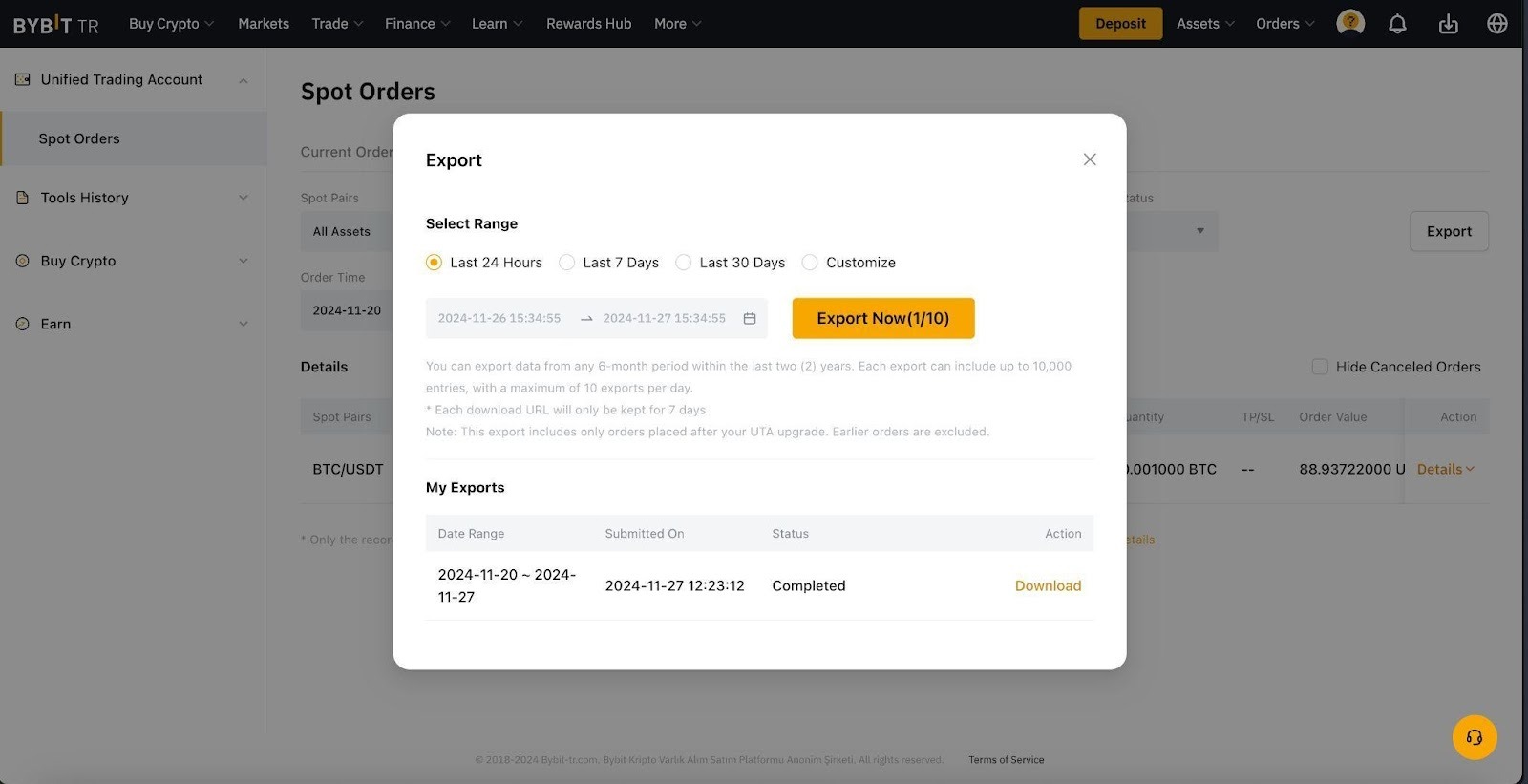 — Spot Order geçmişi gibi bazı veriler hesap özetinde mevcut olmayabilir. Bu verileri dışa aktarmak için lütfen doğrudan her Ürün Geçmişi sayfasına gidin ve sağ üst köşedeki Dışa Aktar düğmesine tıklayın