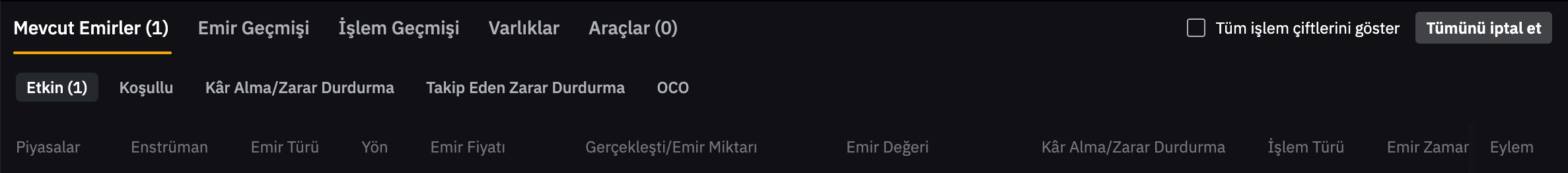 Emir detaylarınızı ve işlem geçmişinizi görüntülemek için lütfen pozisyon bölgesindeki Mevcut Emirler, Eski Emirler veya İşlem Geçmişi bölümünü kontrol edin.
