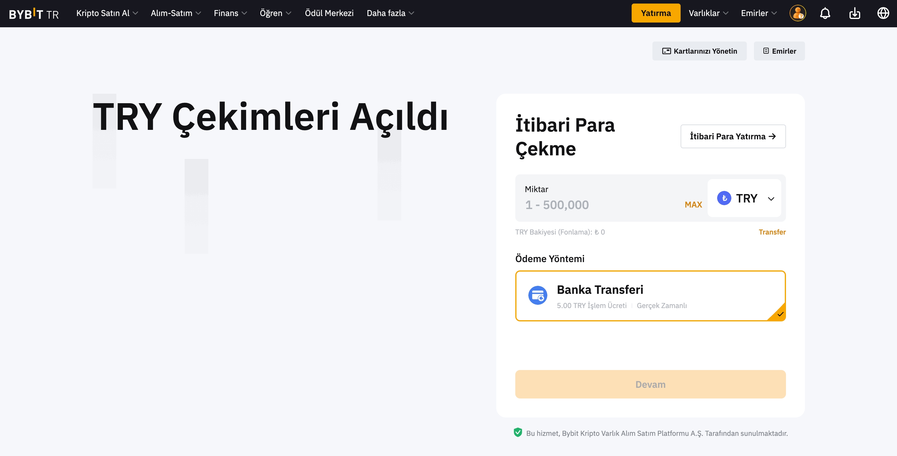 - İtibari para işlemleri, spot işlemlerle aynı ücretlere tabi olacaktır. Daha fazla bilgi için lütfen şu makaleye göz atın: Bybit TR Spot Ücretleri Hakkında Bilgiler
