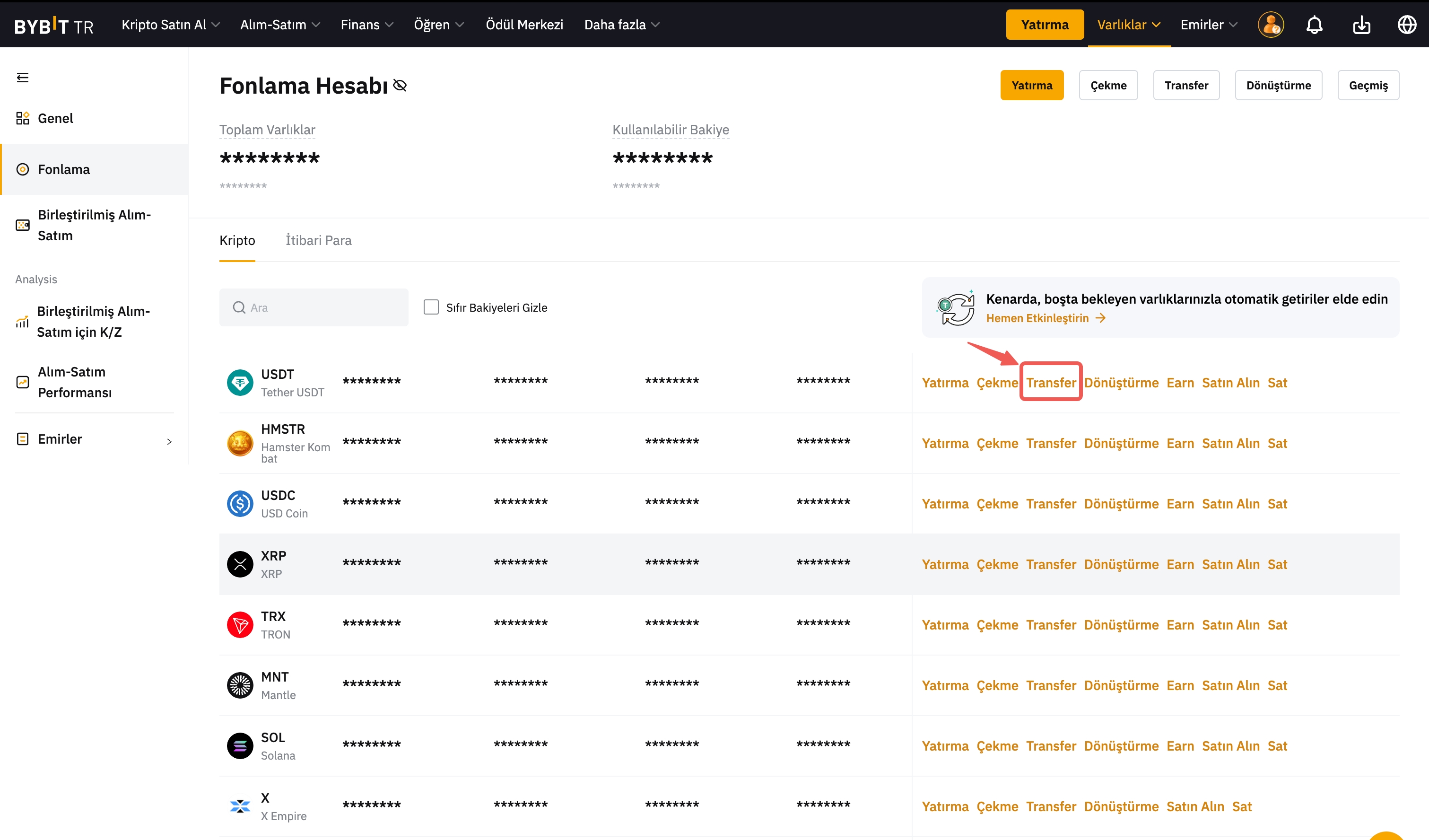 1. Adım: Lütfen Fonlama Hesabı Varlıkları sayfasında transfer etmek istediğiniz itibari para birimi sütununun yanındaki Transfer seçeneğine tıklayın.