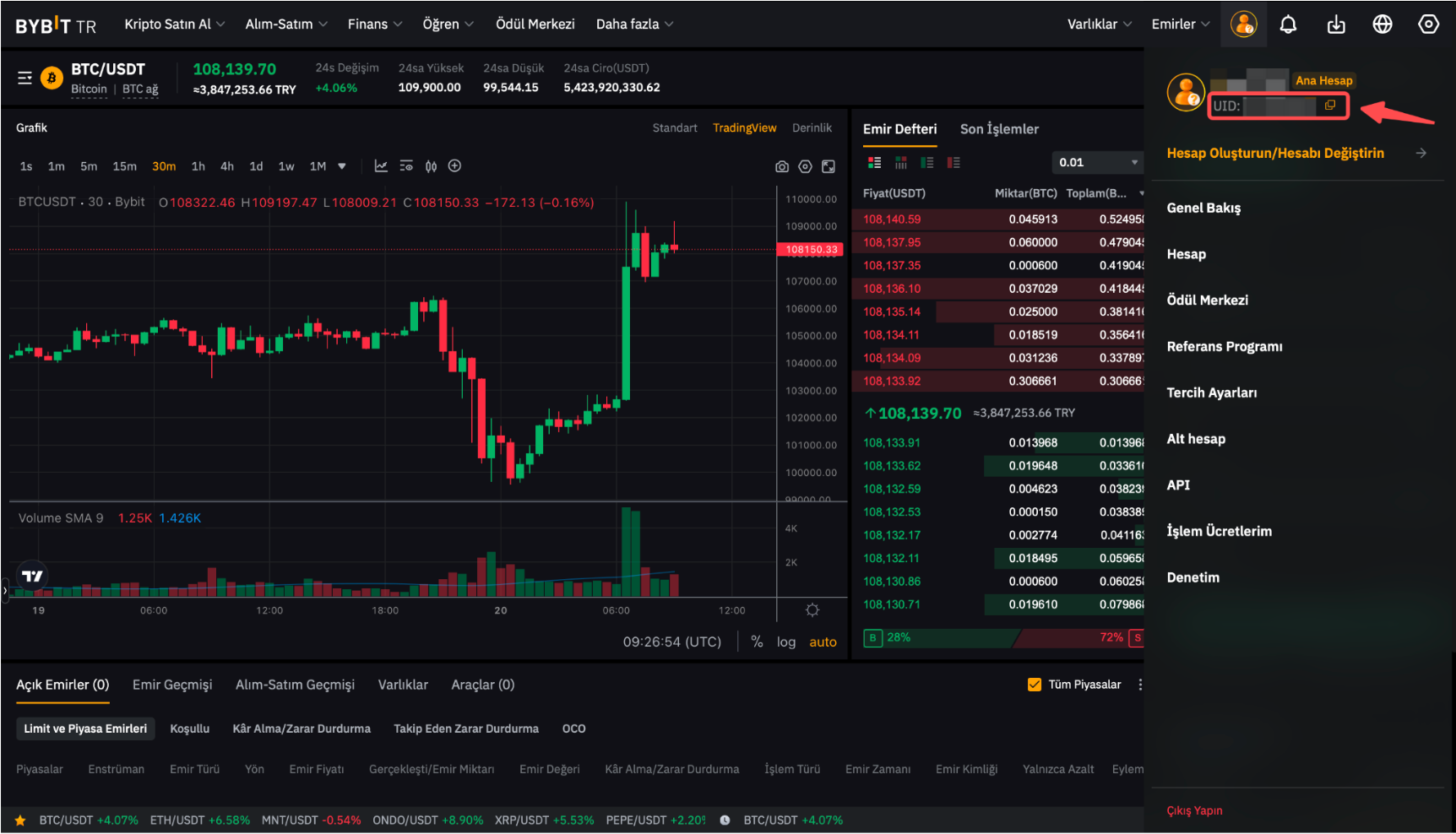 Yöntem 2: Herhangi bir Bybit TR web sayfasının sağ üst köşesinden imlecinizi “Profil” simgesine götürün. Açılır menüde UID’nizi görebileceksiniz.
