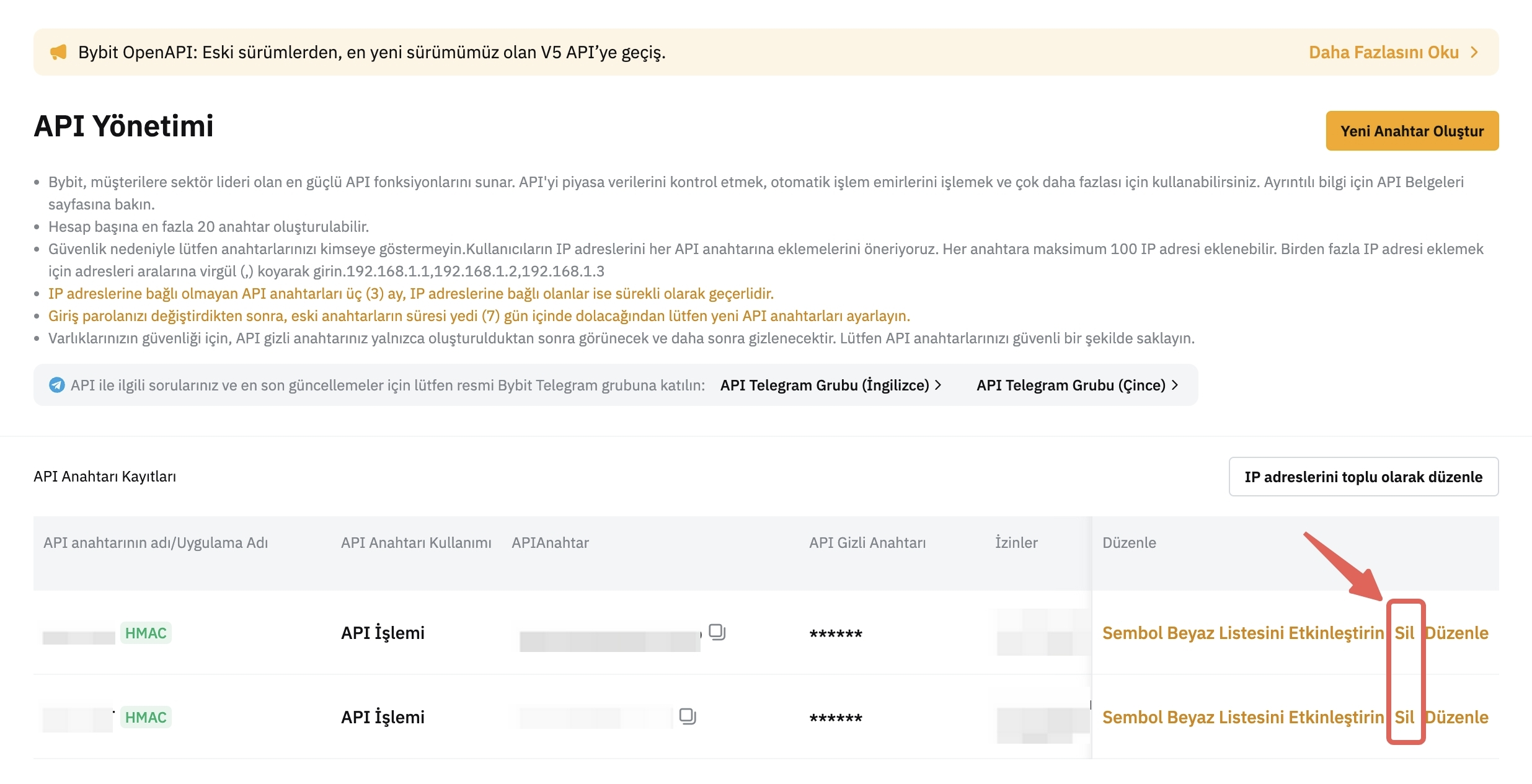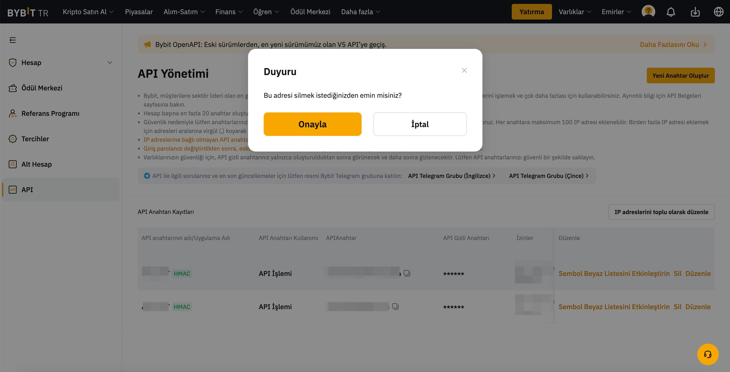 — API anahtarının silinmesi yalnızca PC/web sitesi üzerinden yapılabilir. Bunu Bybit TR Uygulaması üzerinden yapma seçeneği yoktur.