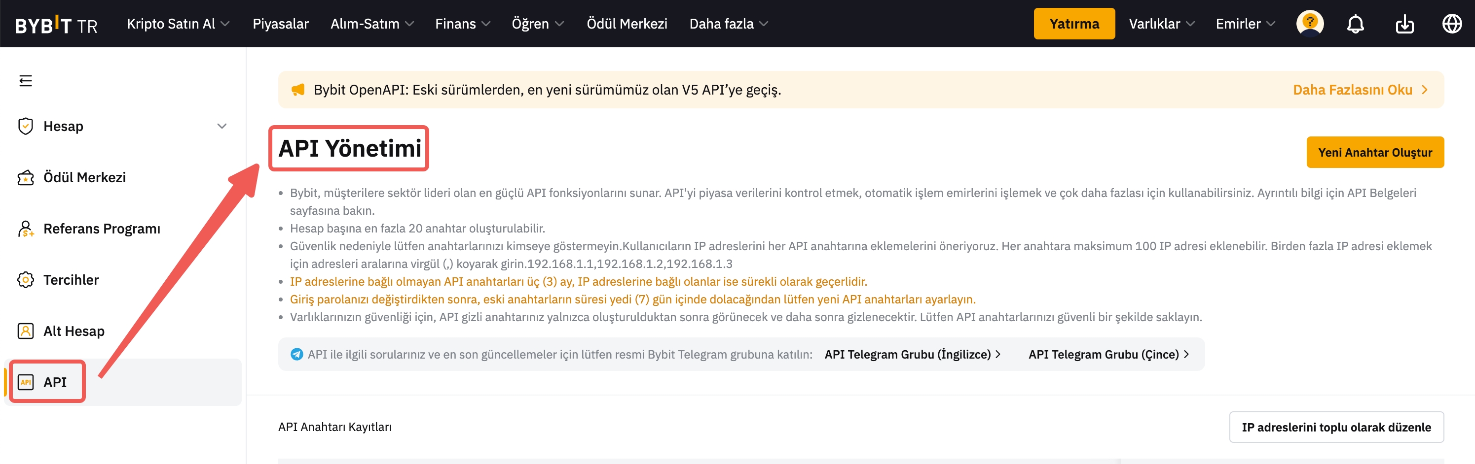 Mainnet hesap ayarları URL’si: https://www.bybit.tr/app/user/api-management