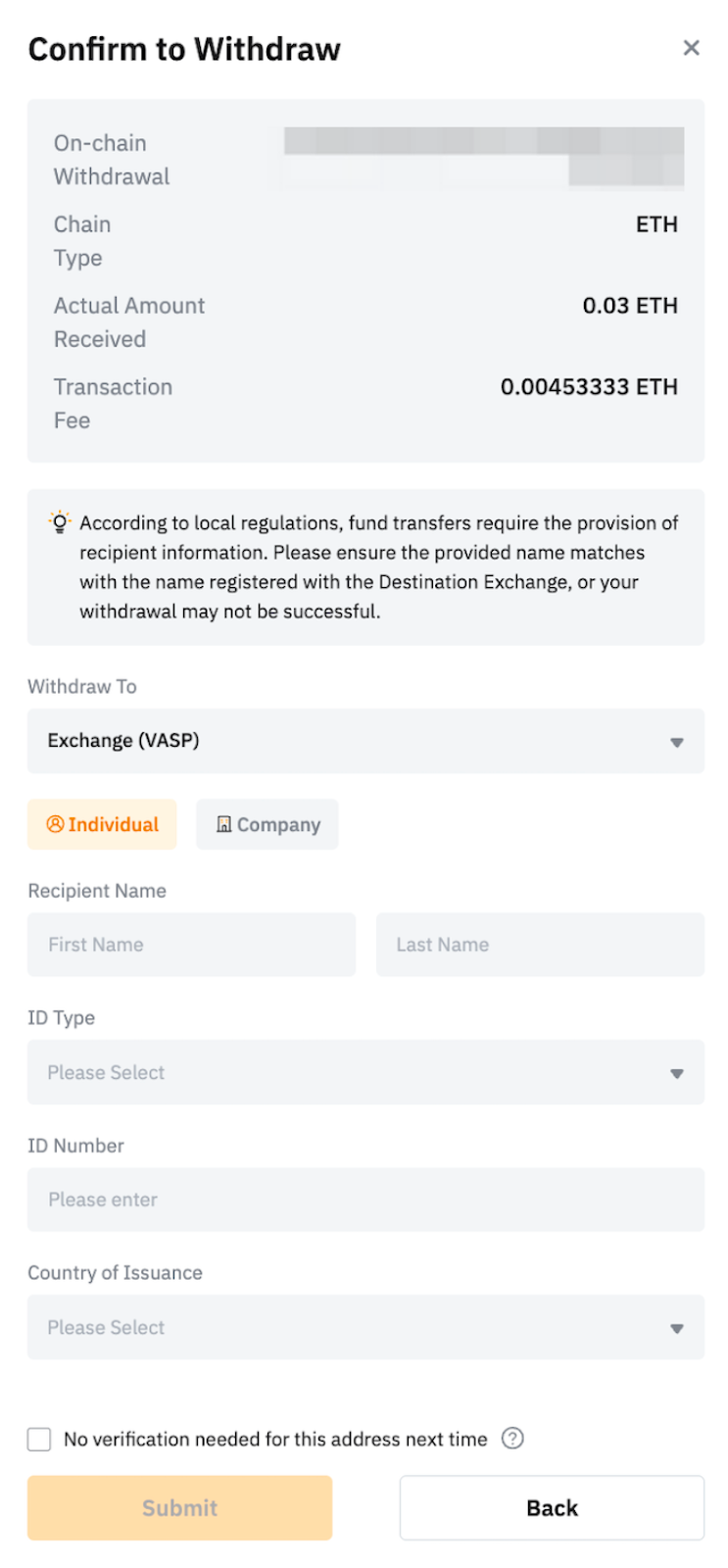 Not: Sağlanan veriler, hedef cüzdanda kayıtlı ad ve kimlikle eşleşmelidir. Aksi takdirde, geri çekme başarısız olur ve iptal edilir. Daha ayrıntılı bir kılavuz için lütfen SSS - Seyahat Kuralı bölümüne bakın.