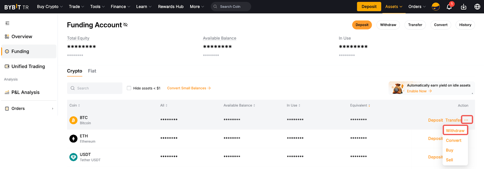 Alternatif olarak, Fonlama Hesabı sayfanıza gidin ve tercih ettiğiniz geri çekilebilir kripto sütunundaki Çekme kısmına tıklayın.