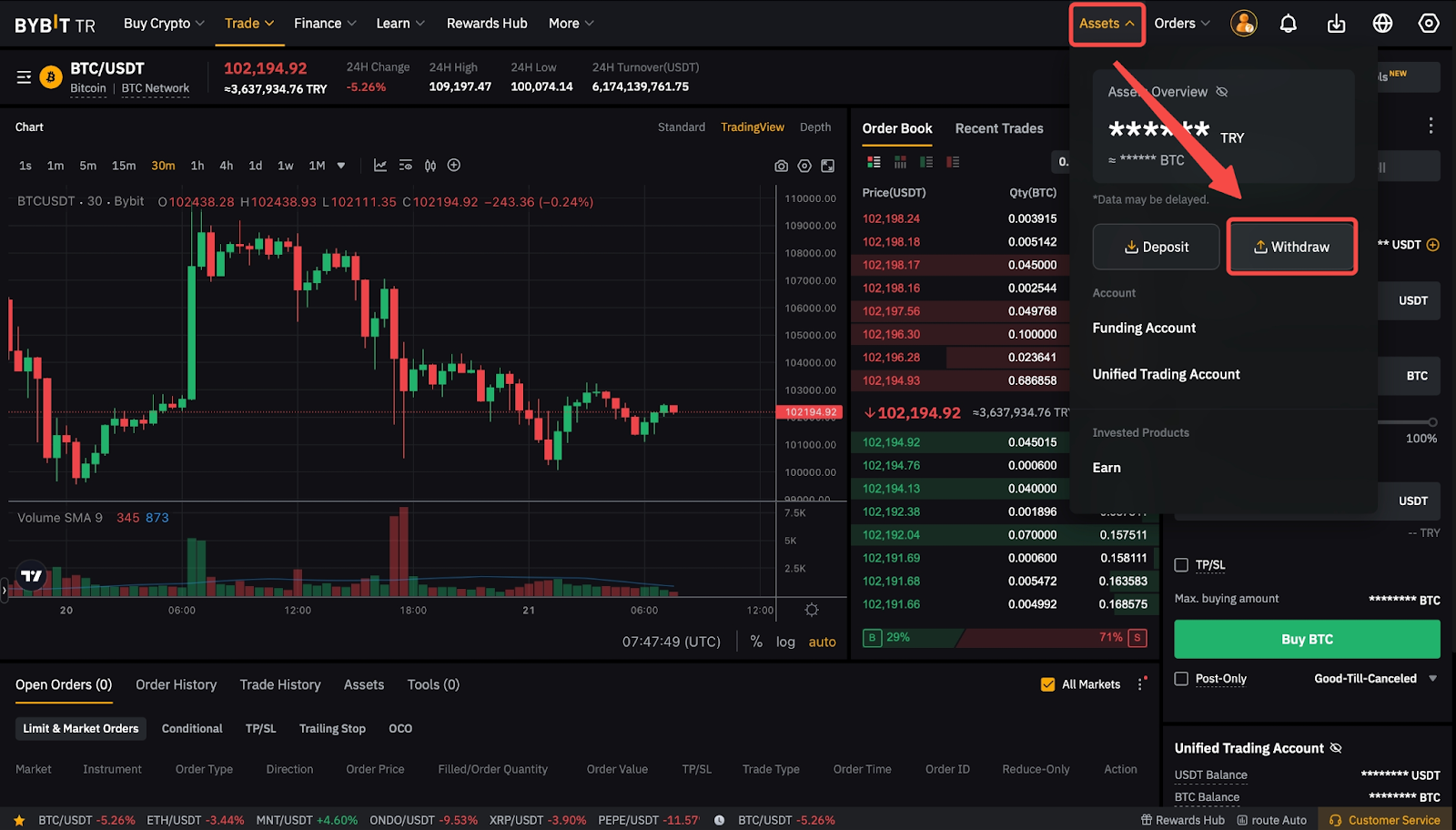 Adım 1: Bybit TR ana sayfasının sağ üst köşesindeki Varlıklar bölümüne gidin ve Çekme kısmına tıklayın.