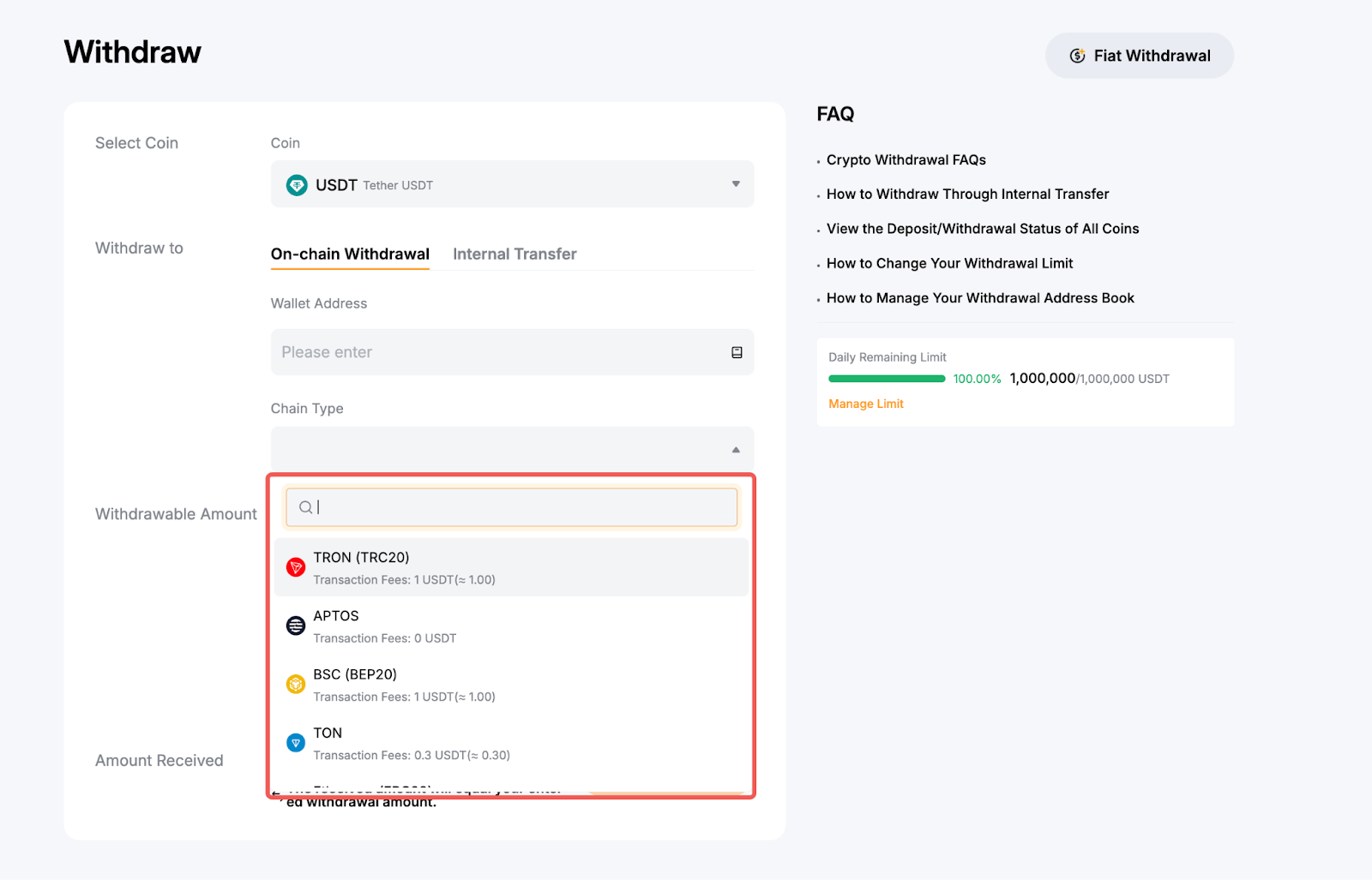 Adım 3: Tercih ettiğiniz zincir türünü seçin. Her blok zinciri ağı için çekim ücreti tutarını bu sayfada göreceksiniz.