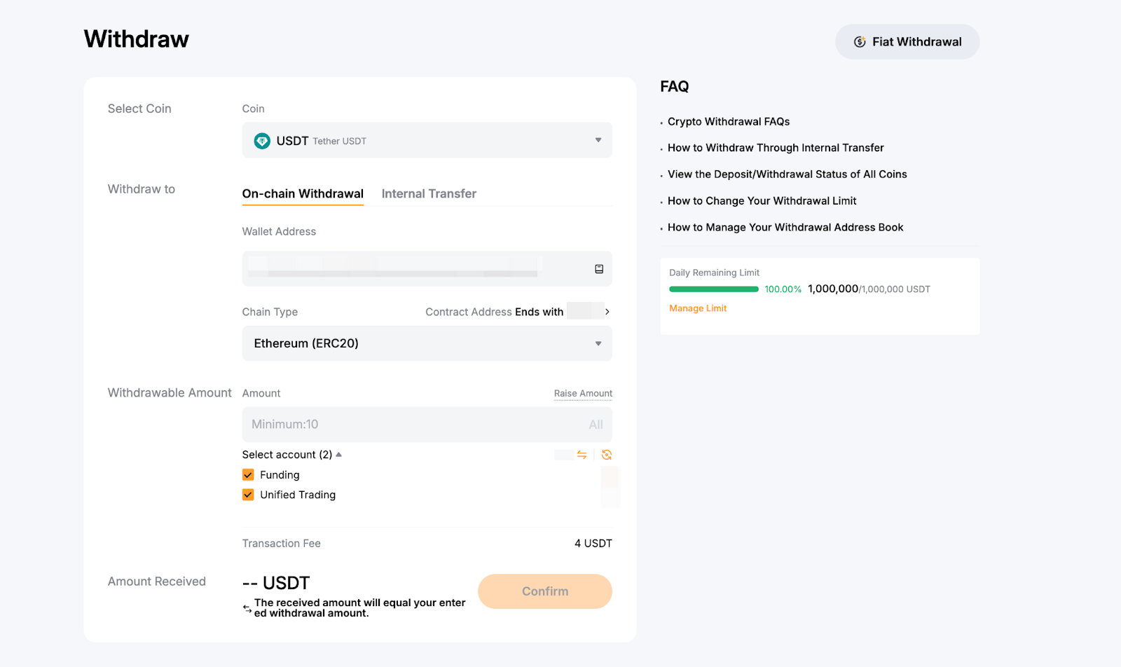Adım 4: Para çekmek istediğiniz tutarı girin veya miktarın tümünü çekmek için Tümü'ne tıklayın. Zincir tipi seçildikten sonra, para çekme penceresinin sağ tarafında bu özel madeni para ve blok zinciri ağı için minimum para çekme limitini de görebileceksiniz.