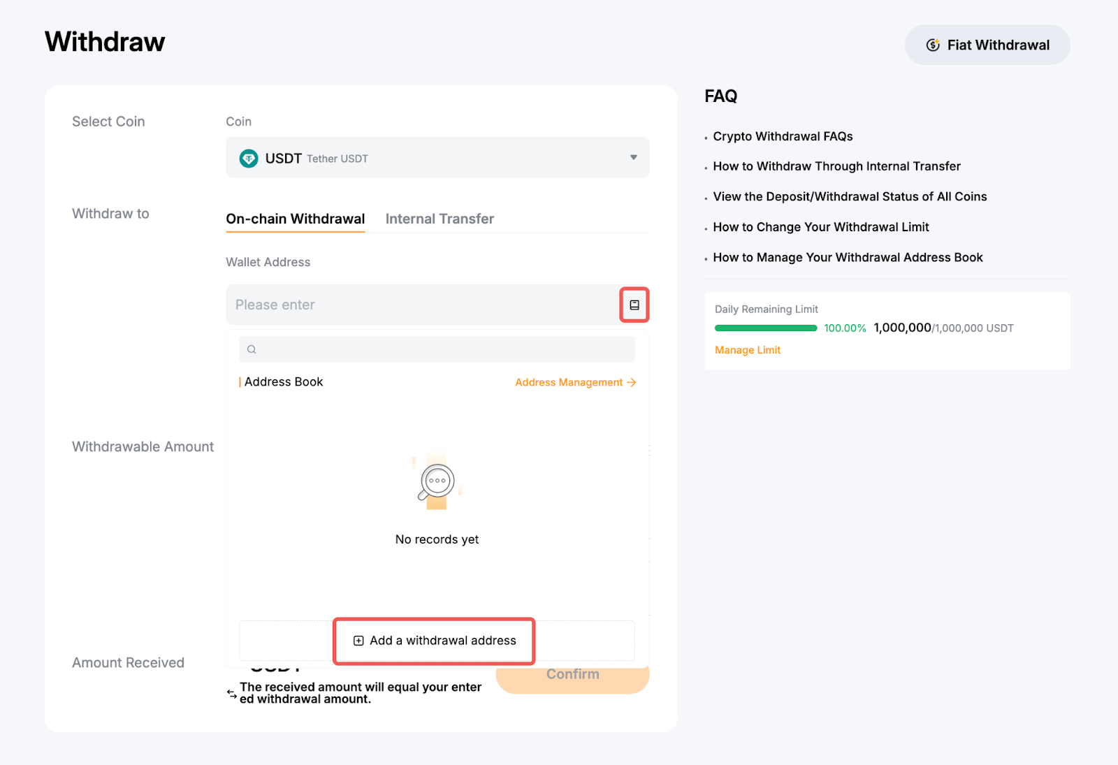 Henüz bir para çekme adresi eklemediyseniz ve bunu yapmak istiyorsanız, lütfen para çekme adresinizi ayarlamak için Ekle'ye tıklayın. Daha fazla ayrıntı için lütfen Çekim Cüzdanı Adresi Nasıl Eklenir? kısmına bakın.
