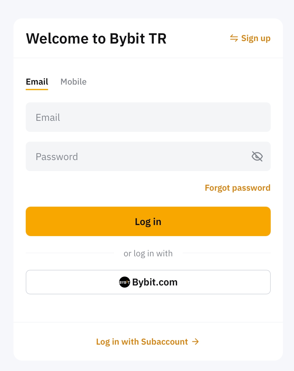 1. Adım: Bybit TR web sitesi aracılığıyla hesabınıza giriş yapın. Bunun için kayıtlı e-posta adresinizi veya cep telefonu numaranızı ve giriş parolanızı yazın.