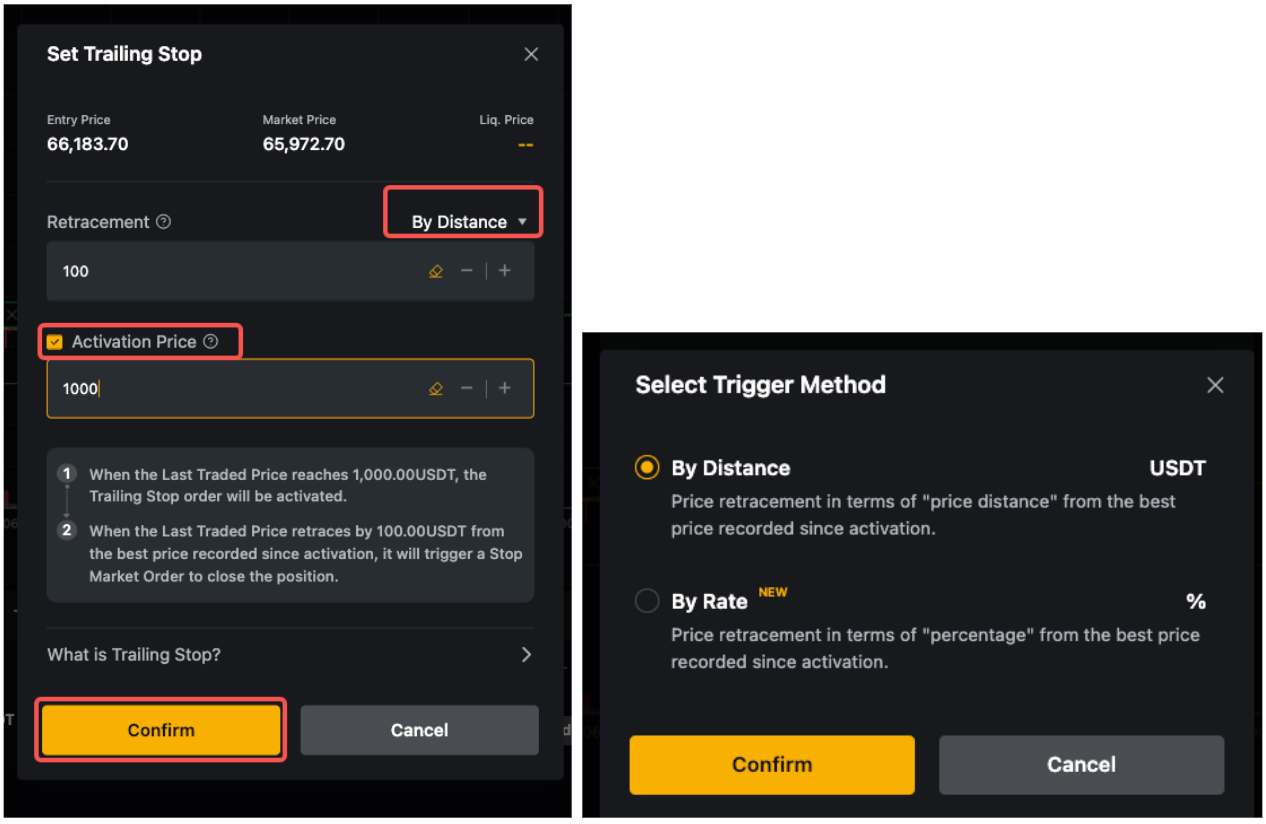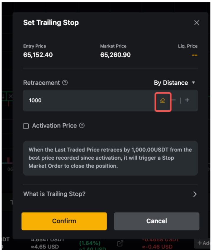 2. Adım: Düzeltme tetikleme yönteminizi (Oran veya Aralığa göre) seçin. Gerekiyorsa bir Aktivasyon Fiyatı belirleyin. Ardından Onayla butonuna tıklayın.