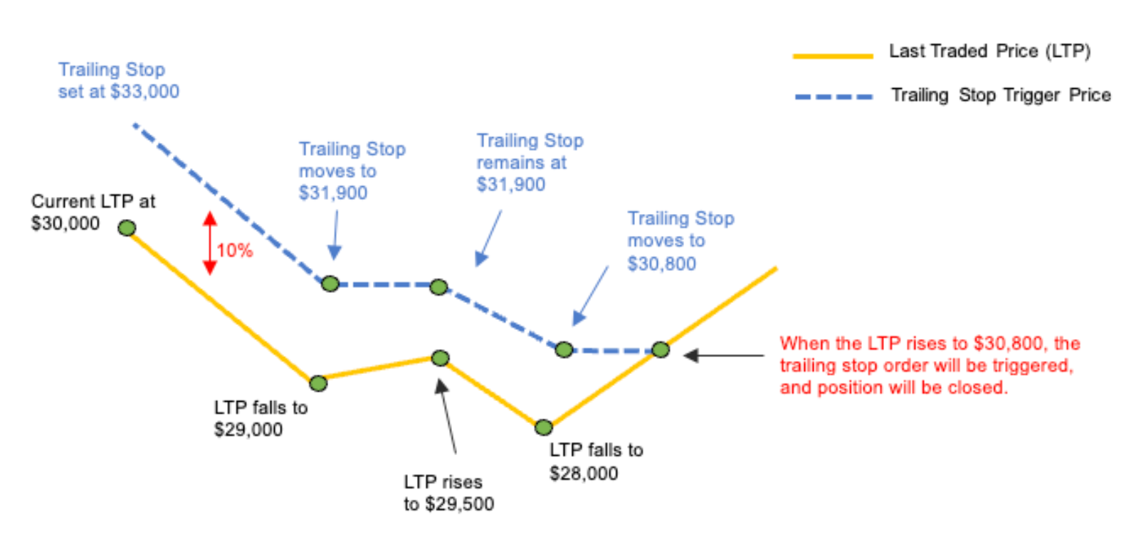 İşlem gören son fiyat 29.000 $ seviyesine düşerse Takip Eden Zarar Durdurma fiyatı, aşağı yönlü %10 oranında olacak şekilde otomatik olarak ayarlanır (düzeltme oranı ayarlaması %0,1’lik aralıklarla yapılabilir). Bu durumda, Takip Eden Zarar Durdurma emri 31.900 $ seviyesinde tetiklenir.