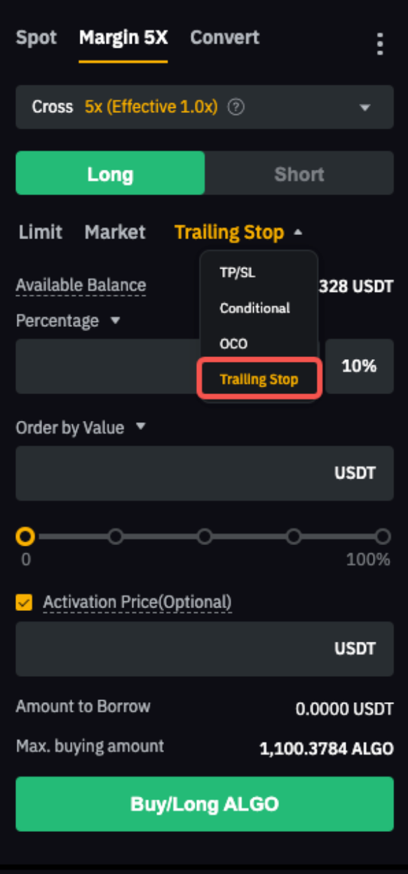 1. Adım: Spot İşlemler sayfasına gidin ve Takip Eden Zarar Durdurma emrini seçin.