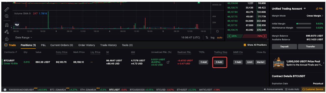 1. Adım: Vadeli ve Süreli Coin-M İşlemleri sayfasında açık pozisyonunuza gidin. Ardından Takip Eden Zarar Durdurma bölümünün altındaki Ekle seçeneğine tıklayın.