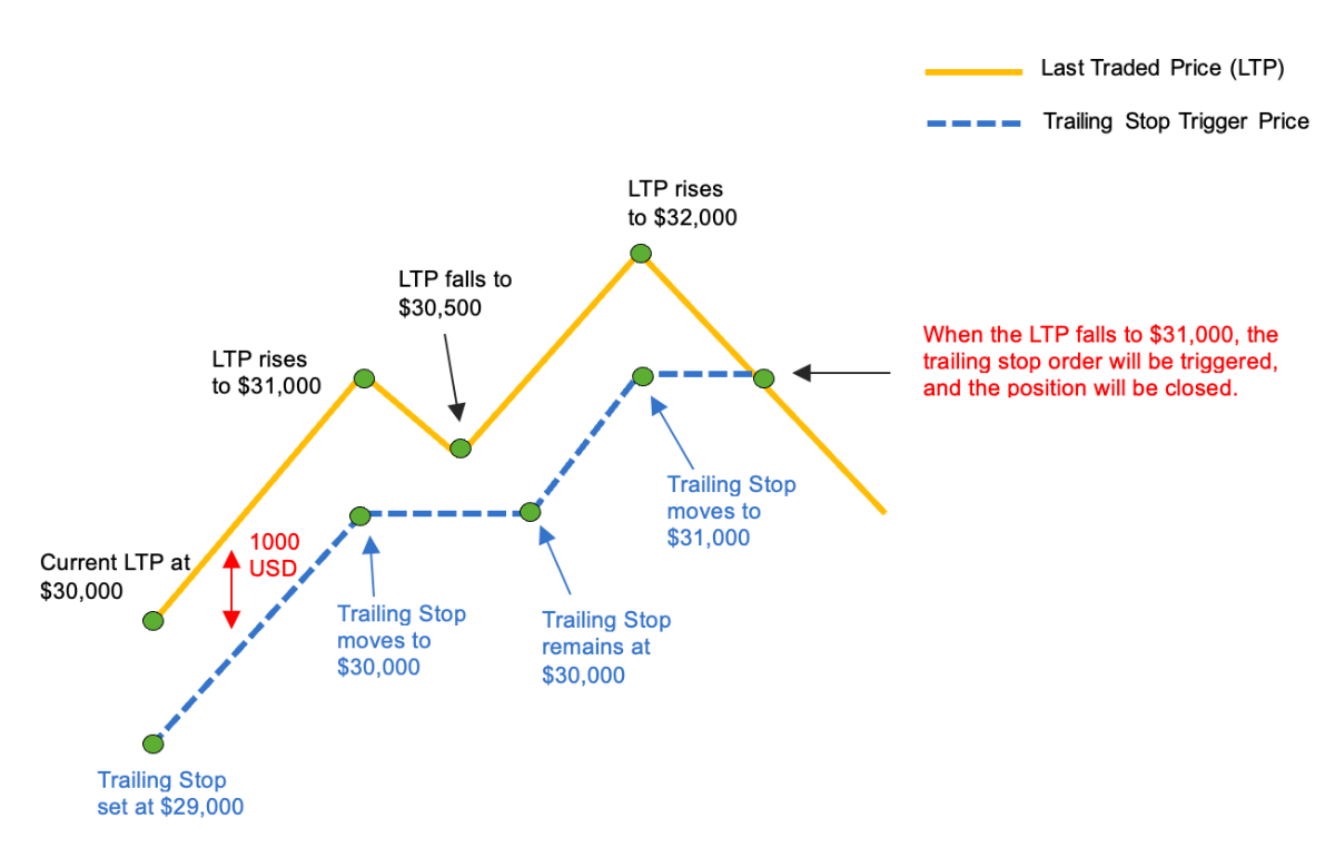 İşlem gören son fiyat 31.000 $ seviyesine çıkarsa Takip Eden Zarar Durdurma fiyatı, yukarı yönlü 1.000 $ olacak şekilde otomatik olarak ayarlanır (düzeltme aralığı ayarlaması 0,5 $’lık aralıklarla yapılabilir). Bu durumda, Takip Eden Zarar Durdurma emri 30.000 $ seviyesinde tetiklenir.
