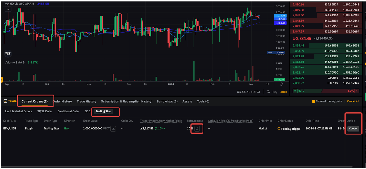 İşlem gören son fiyat 3.700 USDT seviyesine düşerse Takip Eden Zarar Durdurma emri, 3.690 USDT olarak kalır.