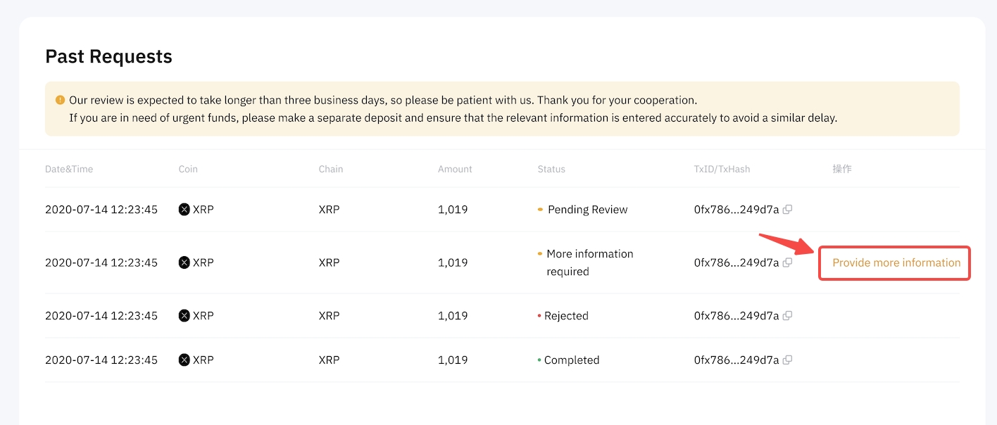 Lütfen talimatları izleyin ve Borsa A'nın yalnızca bir bağlantı sağlaması durumunda blok zincire yönlendirme bağlantısına tıklayarak bize iade TXID'sini gösterin. TXID yalnızca Borsa A ile iletişim yoluyla (müşteri desteğiyle sohbet geçmişi, e-posta veya SMS yoluyla sağlanan iade ayrıntıları veya bir self-servis uygulama aracılığıyla) elde edildiyse, lütfen bize görüşmenin kaydını sağlayın. |