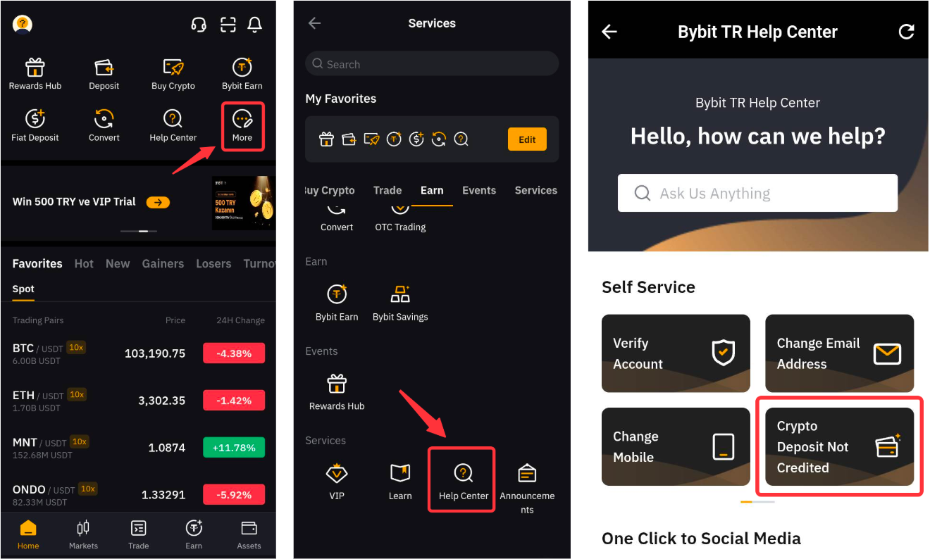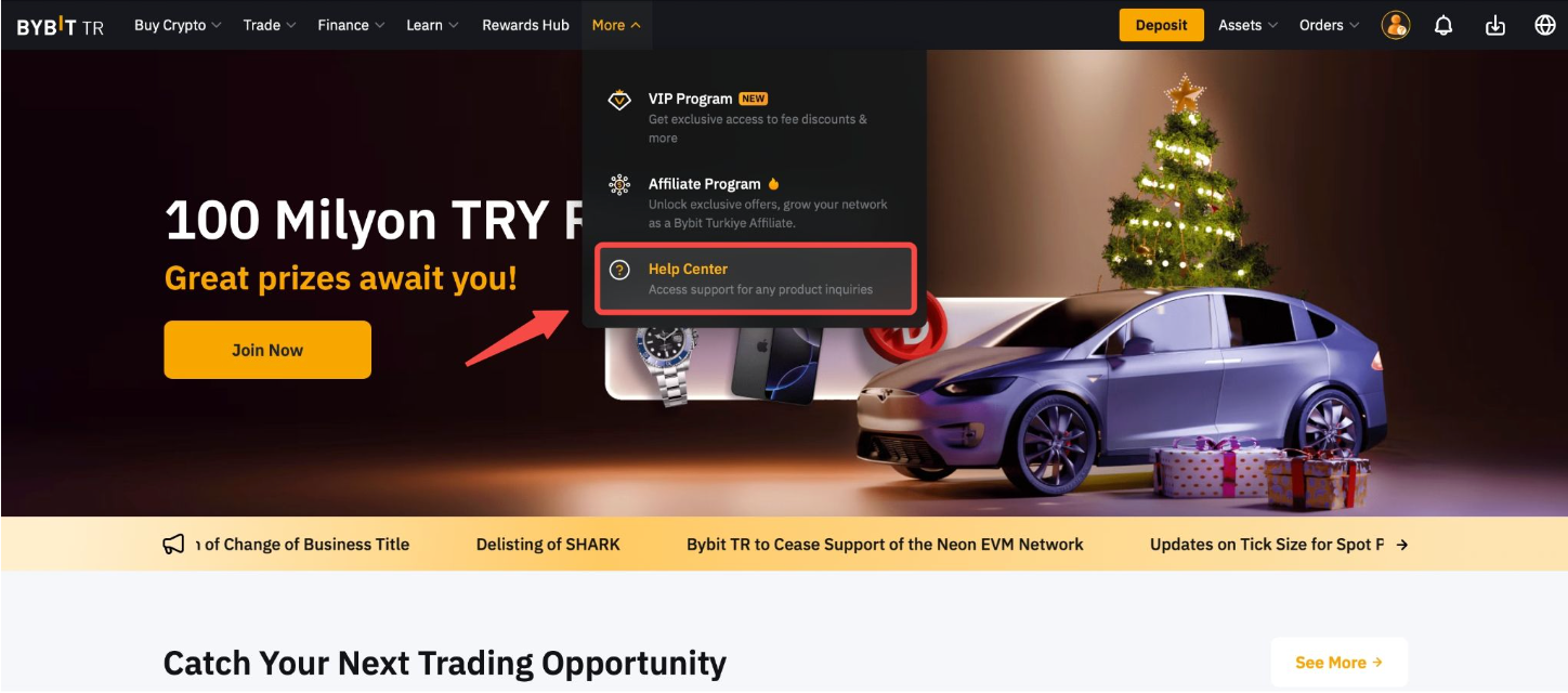 Bybit TR Uygulamasını kullanıyorsanız lütfen ana sayfadaki Daha Fazla seçeneğine ve ardından Yardım Merkezi'ne dokunun.