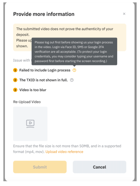 Adım 2: İstenen bilgileri içeren bir videoyu yeniden göndermeniz istenecektir. Soru işareti simgesinin üzerine geldiğinizde ilgili çözüme ulaşabilirsiniz.