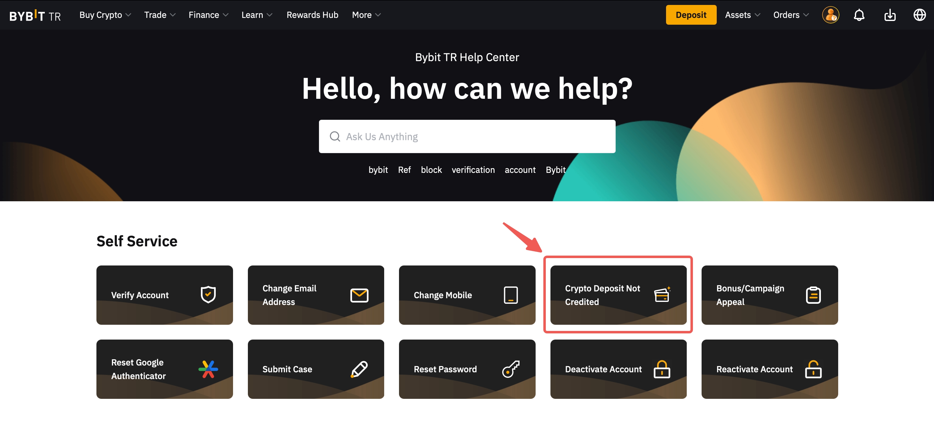 Adım 1: Yardım Merkezini aramak için bağlantıda sol üst köşeye gidiniz → Tamamlanmamış Kripto Para Yatırımı’nı seçiniz; Self Servis sayfasına yönlendirileceksiniz.