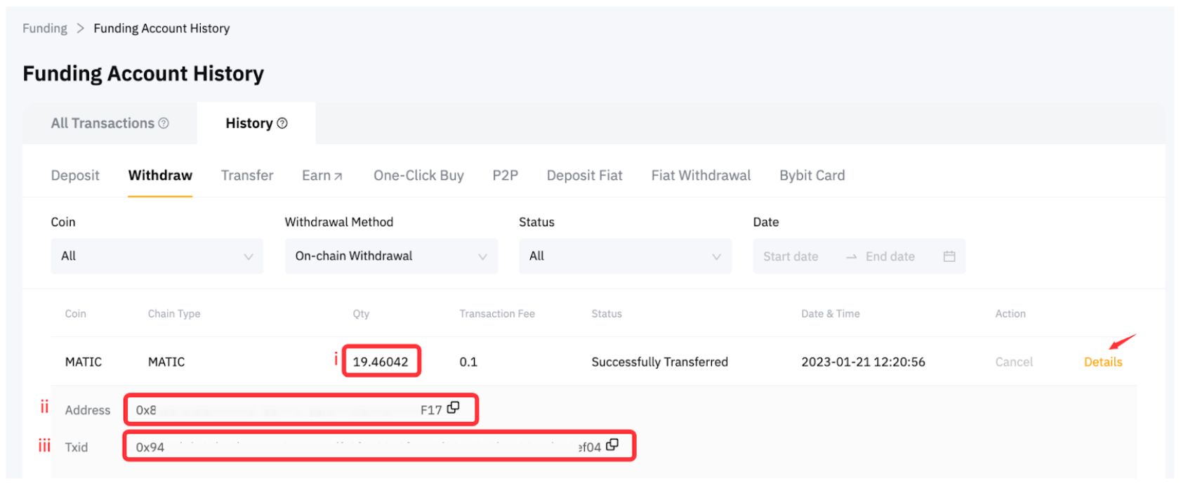 d. Tam iade TXID’sini gösterin veya zincir üzerinden detayları gösterin - Harici platform transfer geçmişi sayfasında tam TXID olmadığı fakat linkin bulunduğu durumlarda lütfen linke tıklayarak zincir üzerinde bizlere detayları gösterin.