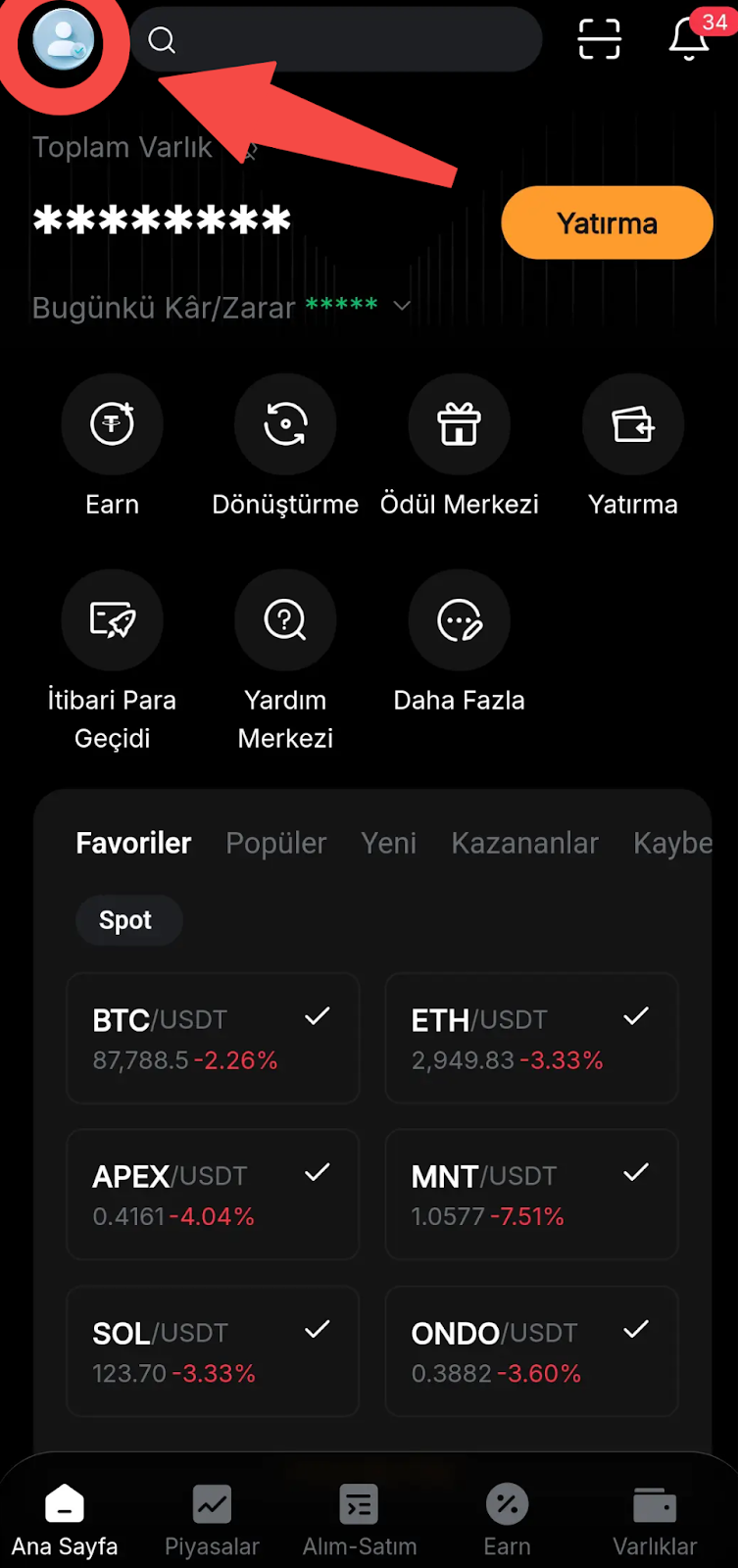 Adım 1: Bybit TR uygulaması ana sayfasının sol üst köşesinde bulunan Profil Resmi simgesine dokunun.